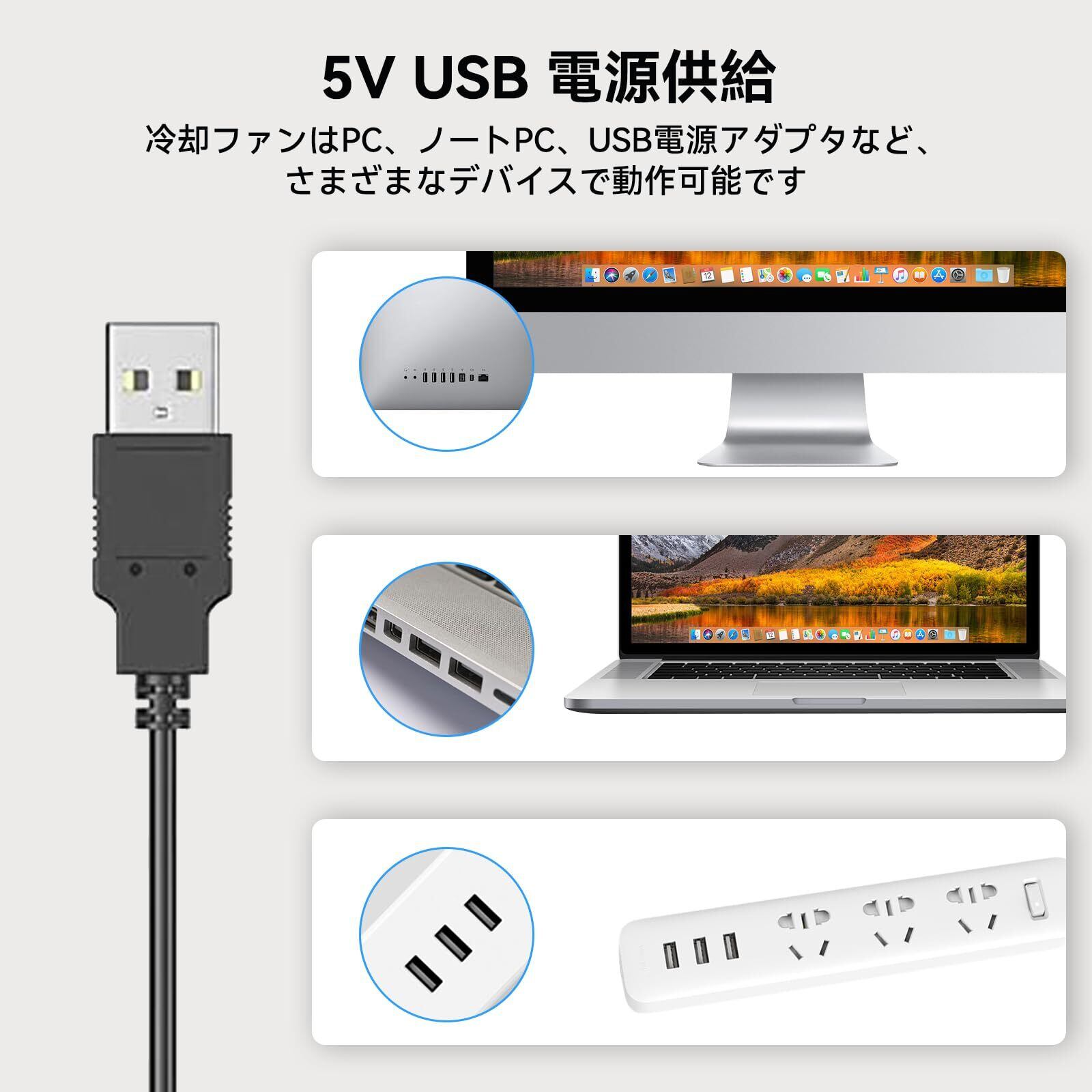 【静音&安定した風量】7枚羽根で安定した風量を確保します。パソコン、ルーター、HDDなどの機器はもちろん、AV機器やゲーム機などの電子設備を速やかに冷却できます。超静音設計で、自習室、図書館などの静かな場所に使っても、気になりません。電圧: 3.5/4.2/5 V、電流: 0.16/0.19/0.24 A。風回転数:1000/1250/1500RPM。ご注意:5Vを超える電圧が禁止。