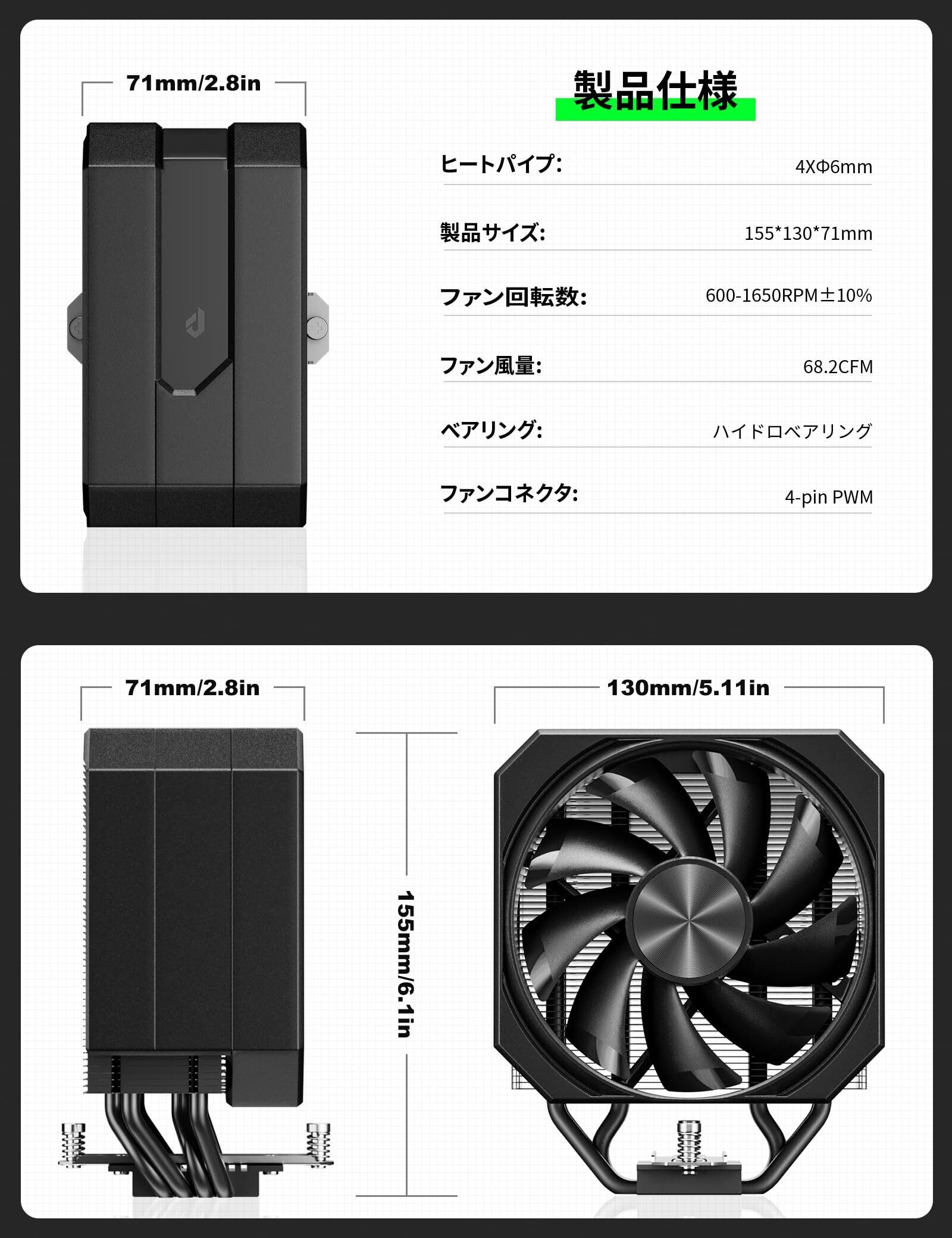 【高性能と低騒音】高静音PWM120mmファンにより、回転数:600-1650RPM士10%、風量:68.2CFM、騒音レベルは≤26 dB(A)で。高密度のマトリクスフィンアレイを用いたタワー型アルミニウムフィンをレイアウトとし、高い放熱効率を発揮することができる。CPUヒートシンクTDPは230Wである。伝達された熱は、4本6mmヒートパイプを通じて特殊な形状のアルミニウムフィンから効果的に伝達される。超静音気流ファンを組み合わせて、極致のCPU放熱性能を達成することを目的とする。