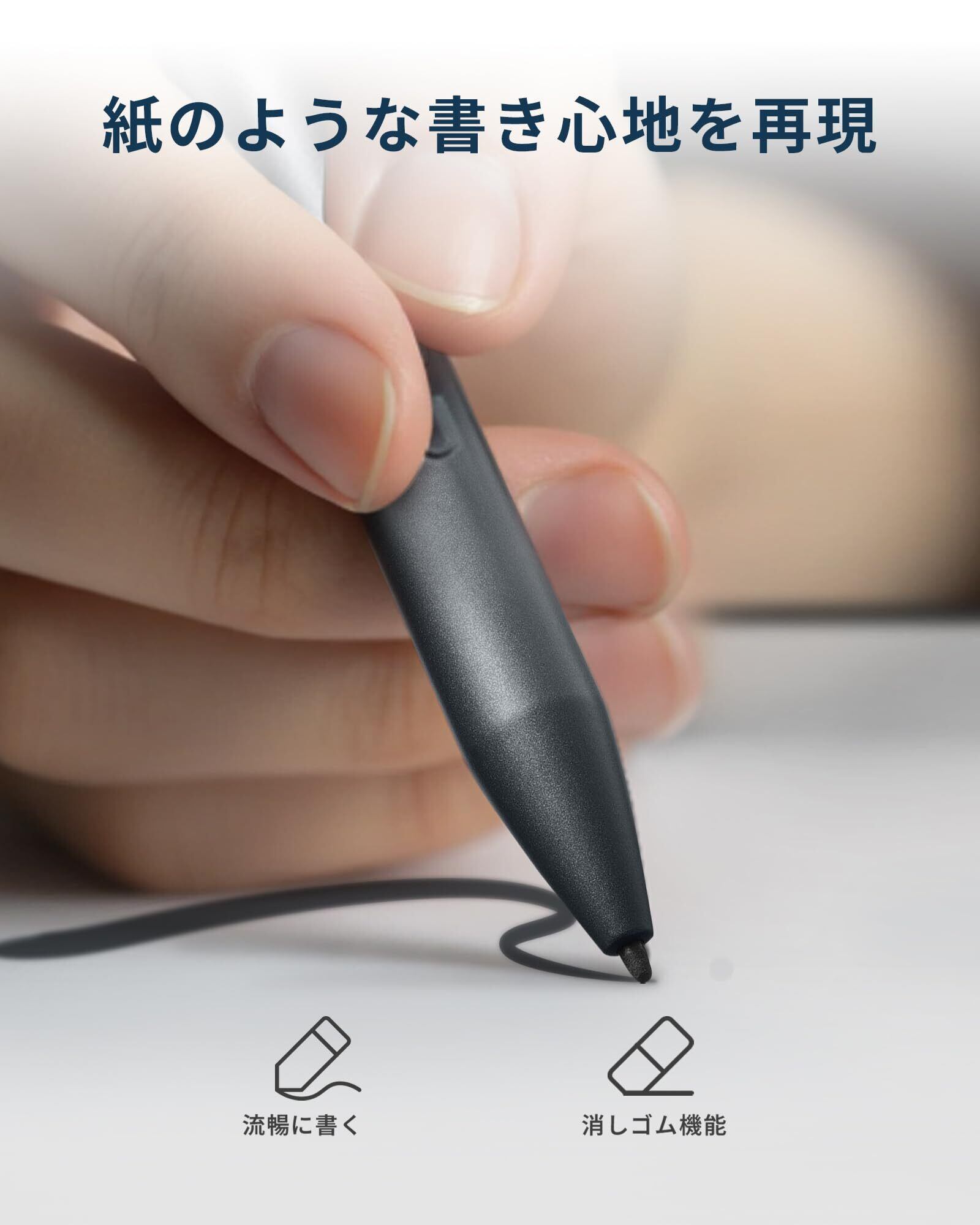 【傾き検知機能】ペン先は傾き検知機能に対応しており、スケッチや描画、メモ取りの際に、より自然な筆記・描画が可能です。紙の上に書くようなリアルな感覚で、創造的な作業をサポートします。
