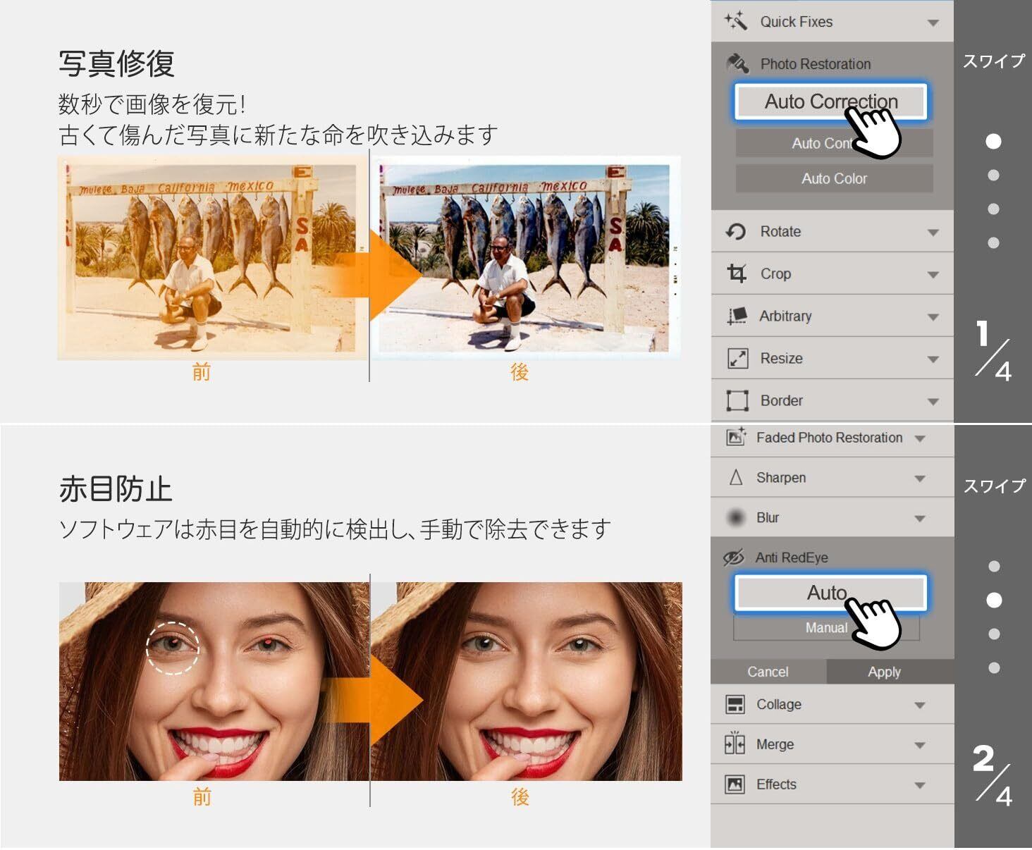 強力な画像補正機能が含まれています。 マウスをクリックするだけで、古 い色あせた画像をすばやく強調して復元します
