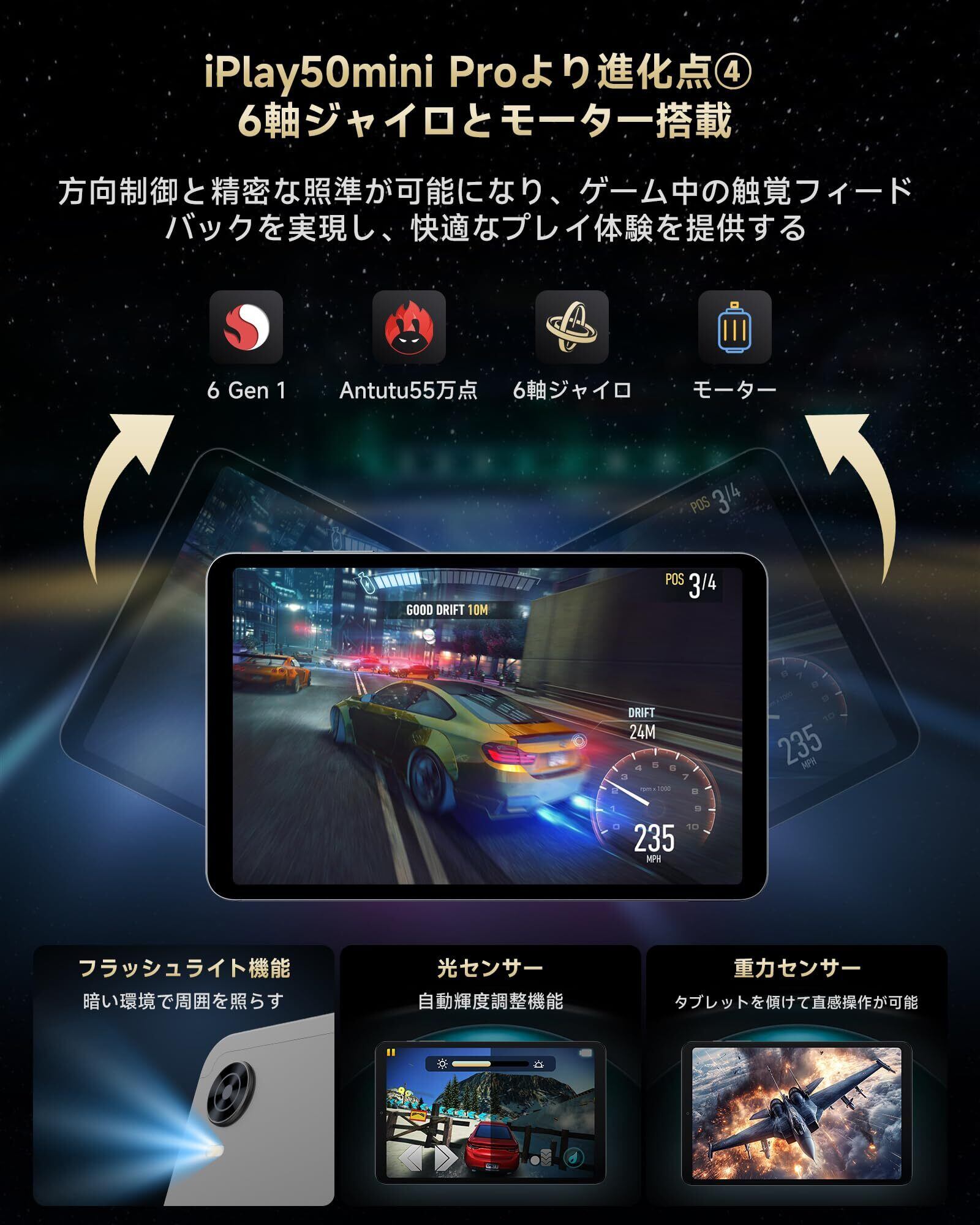 【CPU Snapdragon 6Gen1 、GPU Adreno 710】iPlay60mini Turbo 8.4インチタブレットは4nmプロセス製法を採用した8コアプロセッサを搭載します。性能重視のCortex A78コア(2.2GHz×4)と効率性に優れたCortex A55コア(1.8GHz×4)の組み合わせにより、AnTuTuスコアは驚異の約55万ポイントを記録します。従来の6nmプロセスHelio G99搭載タブレット(同約35万点)と比較して、処理速度と電力効率が40%向上し、ダブルタップ時の画面起動速度が50%短縮されるほか、電源ボタン操作時の即時反応を実現。Adreno 710 GPUの採用により、Helio G99のMali-G57 GPUと比較してグラフィックレンダリング性能が飛躍的に向上し、高負荷なゲームタイトルや動画編集作業でも安定したパフォーマンスを発揮。60Hz表示環境下においてもSnapdragon 6Gen1チップセットはゲームフレームレートの安定性に優れ、滑らかな操作感覚を提供します。