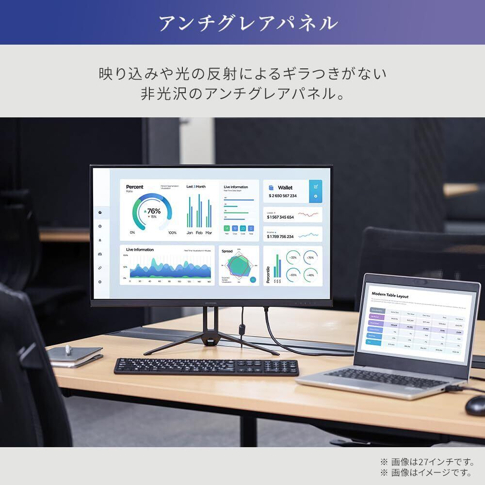 【こだわりのディスプレイ】事務処理などに便利な液晶ディスプレイです。HDMI・VGA端子搭載でPCを接続可能。パソコンの画面を映し出し、デュアルディスプレイにすると作業効率UP!フレームの淵が気になりにくいためおすすめです。Full HD(1920×1080)の高解像度です。角度を変えてもほとんど変わらない色再現が可能な広視野角パネルを搭載。繊細な色再現が臨場感を与えます。