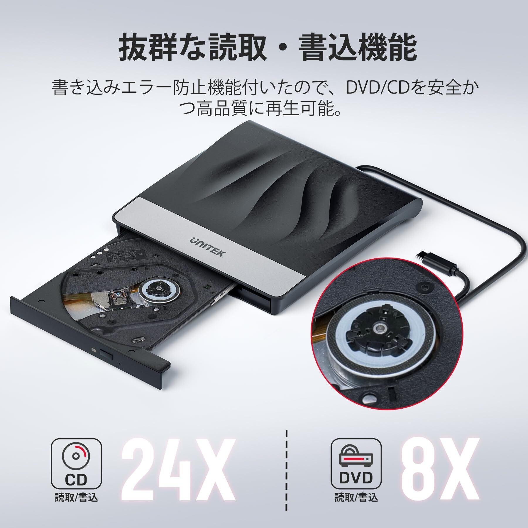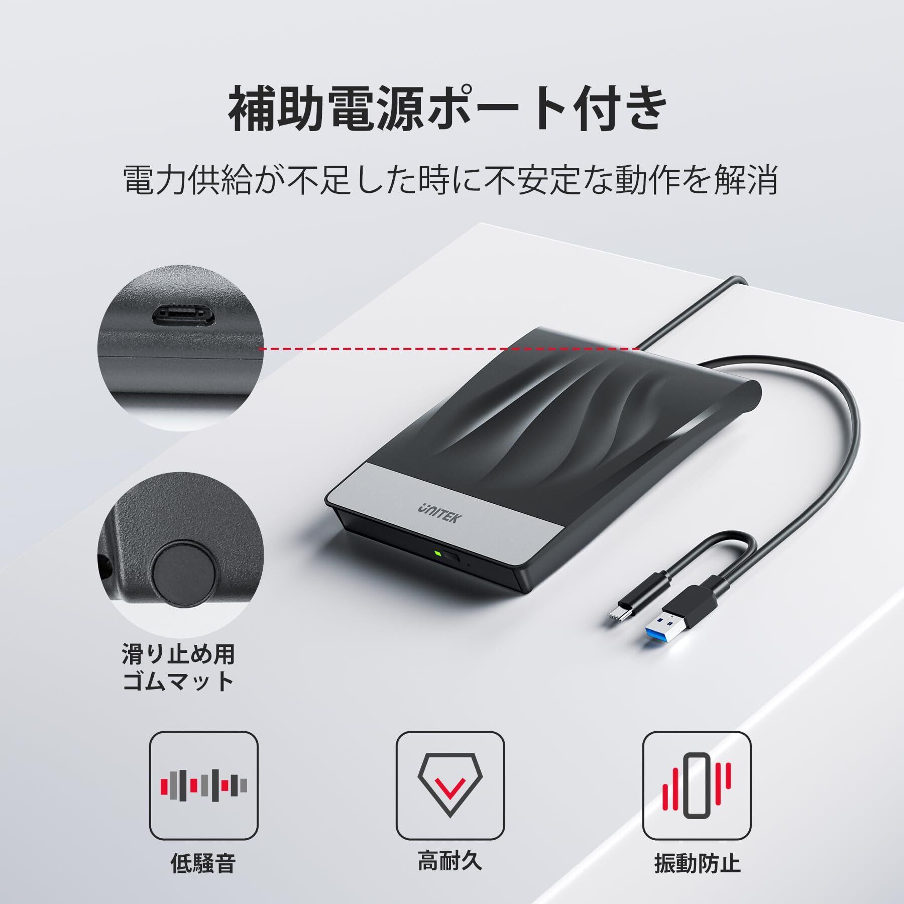 Unitek 外付けCD/DVDドライブ USB 3.0/Type Cポート付き ポータブルドライブ 読み込み・書き込み 【Windows 11/10/8/7・Mac Pro/Air・MacBook・Linuxなどに対応】 薄型 超高速 軽量 コンパクト 静音 焼損防止 補助電源入力ポート スリム