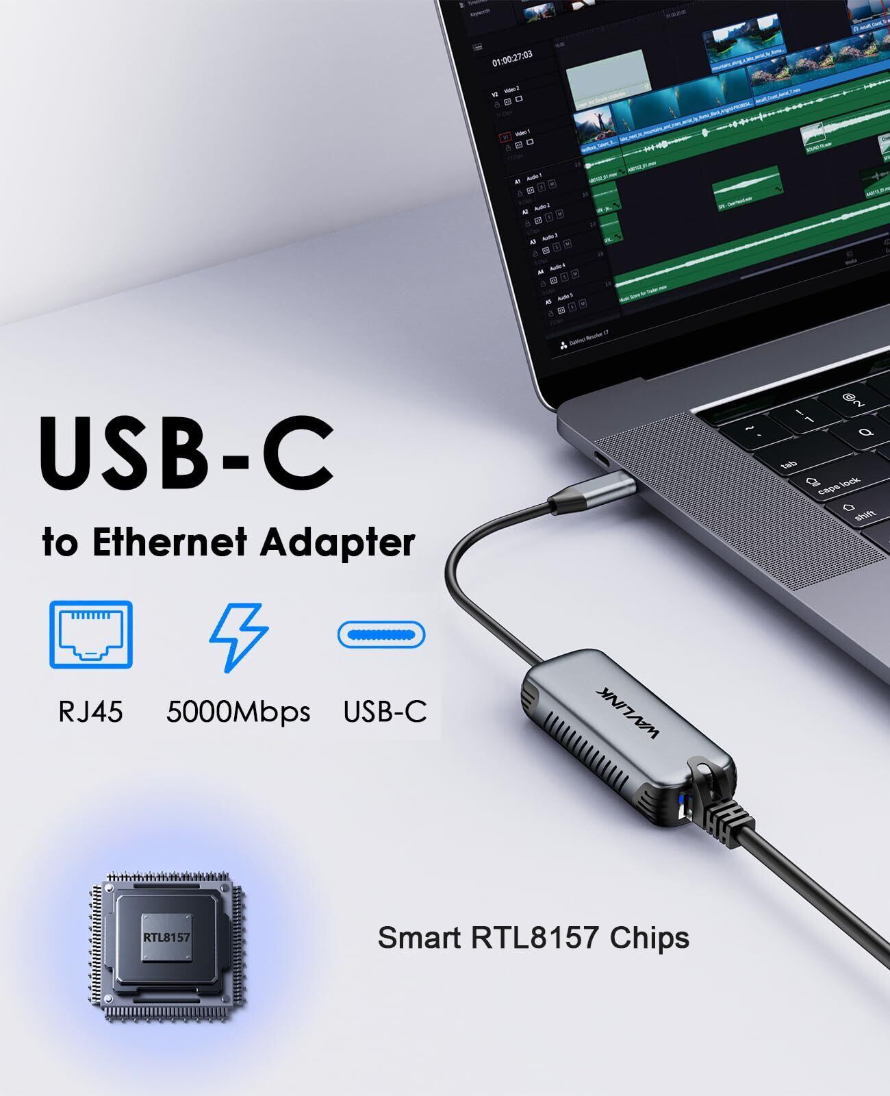 WAVLINK 5Gbps USB C - イーサネットアダプター、5000Mbps USB-C - RJ45ネットワークコンバーター、アルミニウムケース、Windows、Mac OS、iPad OSなど用、RTL8157チップセット、(5GbpsにはType-C>3.2が必要)。