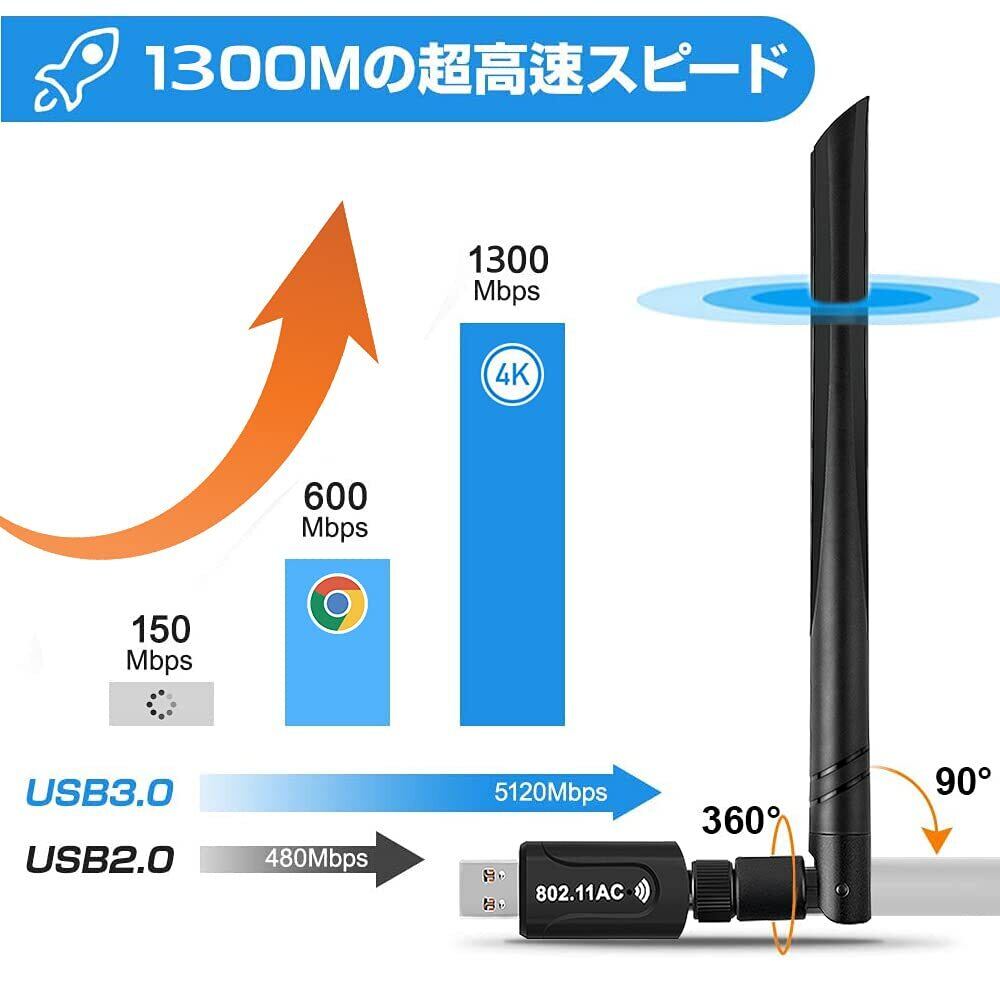 無線LAN 子機 1300Mbps wifi アダプタ 2.4G/5G USB3.0式 5dBi高速通信 360度回転 802.11ac/n/a/g/b Windows 7/8/10/Vista/XP/Mac OS X 対応 【技適認証番号:R 204-920417】