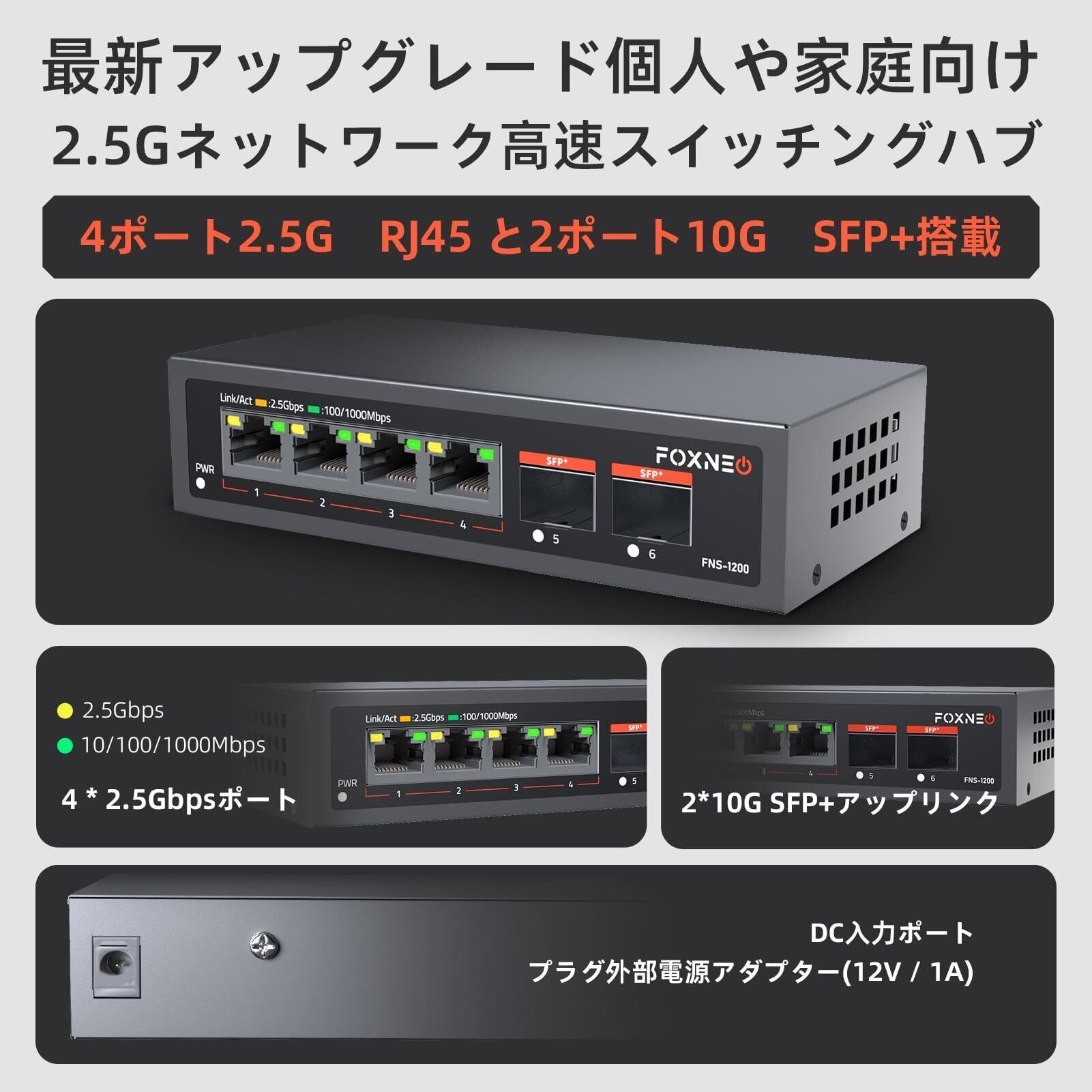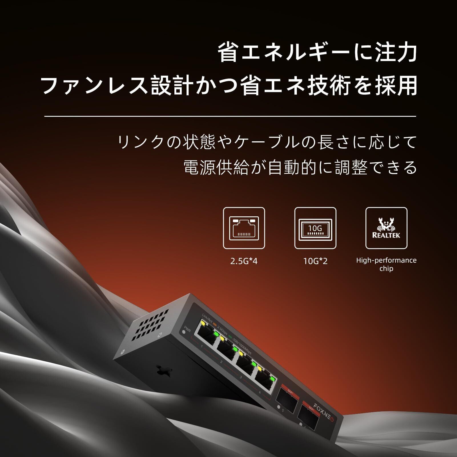 FOXNEO 2.5gbps スイッチングハブ 6ポート(4x2.5G RJ45と2x10G SFP+)搭載 個人や家庭向けのスイッチングハブ 静音ファンレス設計 デスクトップや壁掛け設置可能 金属筐体 プラグアンドプレイ アンマネージド スイッチングハブ
