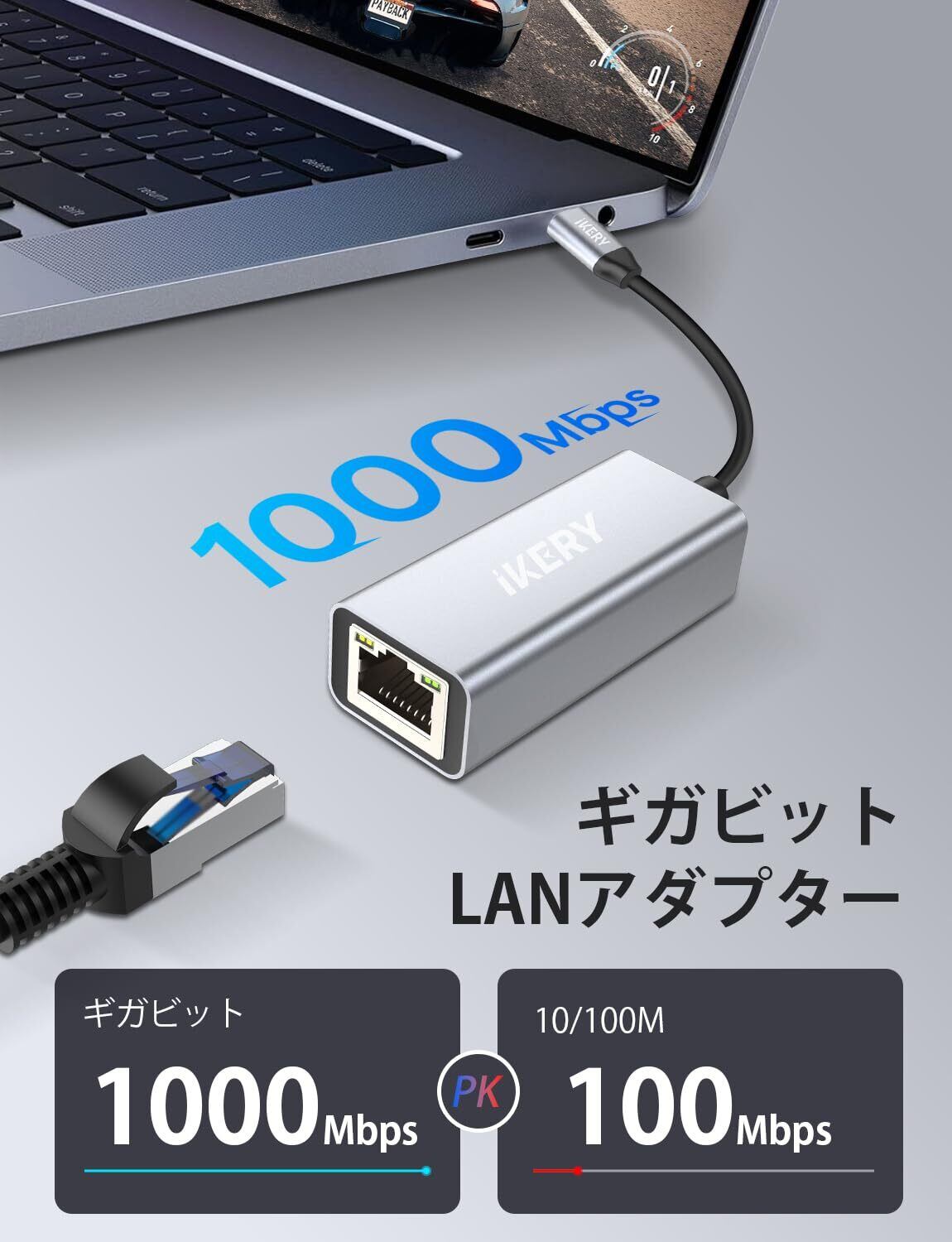 IKERY 有線LANアダプター usb-c イーサネットアダプター Type-C lan 変換アダプタ1000Mbps 高速 RJ45 ギガビットイーサネット LAN ケーブル 変換 MacBook, iPad Pro, iMacなどに対応