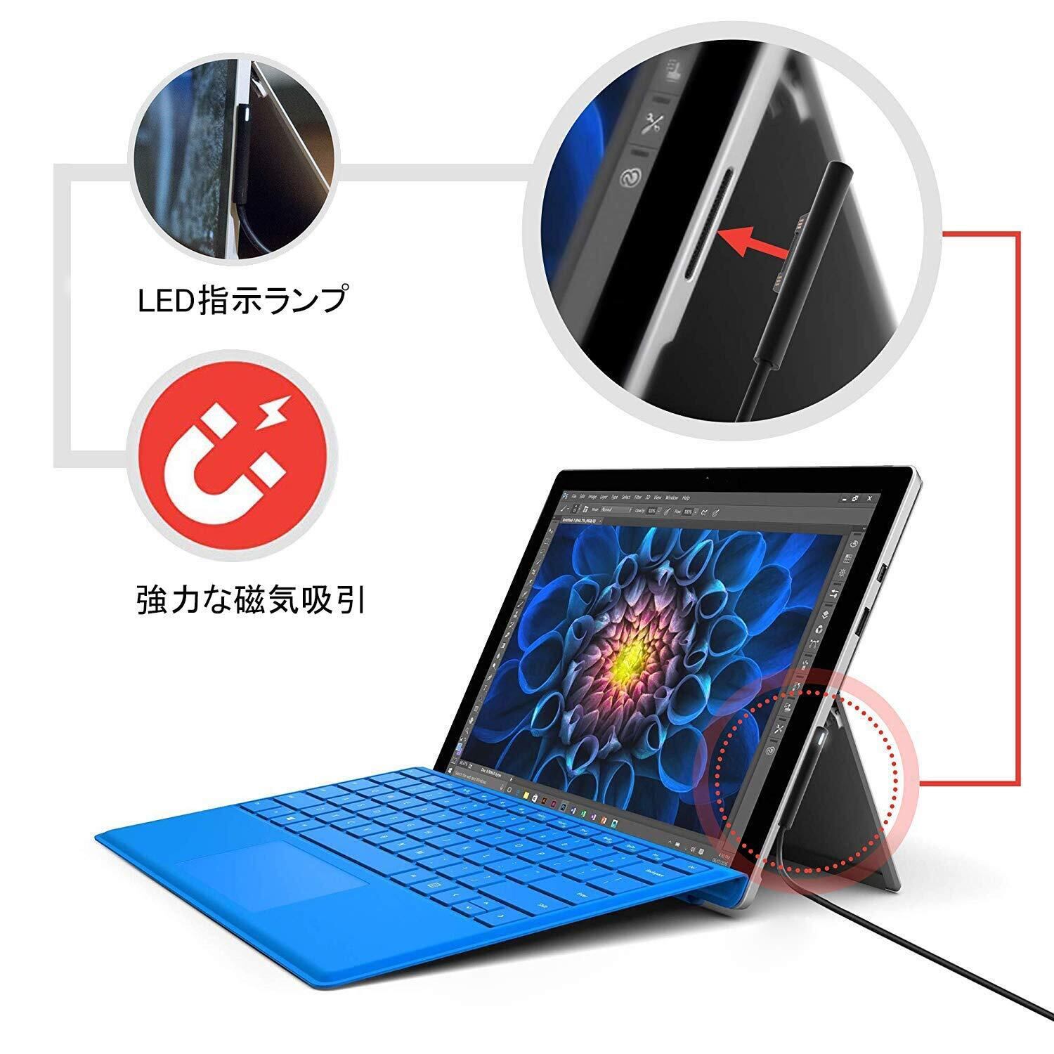 【対応機種】Microsoft Surface Pro 11/10/3/4/5/6/7/7+ 、Surface Laptop1/2/3/6、Sruface Book1/2、Surface Go4/3/2/1。Surface Pro8/9 Laptop4/5 Laptop6(15インチバージョン) と互換性がありますが、技術的な制限により、システムに「遅い充電 q 接続済み」と表示されるので、通常どおり作業して楽しむことができます。