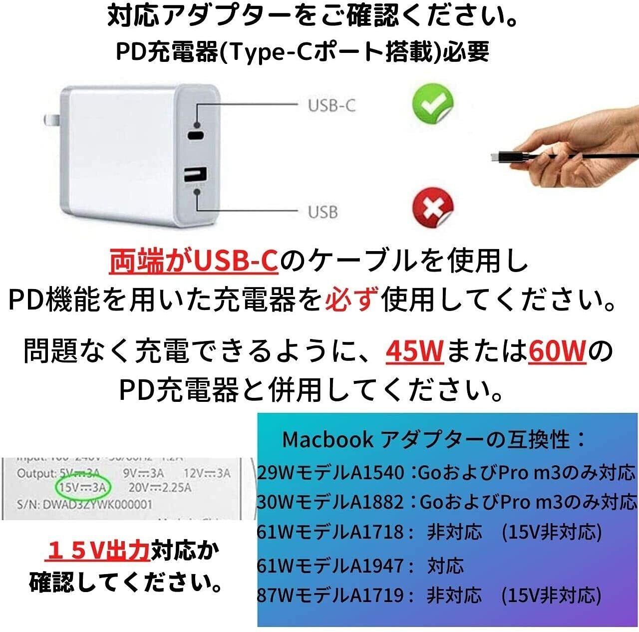 【トラブルシューティング】 1. LEDが点滅する場合:充電器の電圧が不足していることを意味します。 15V3A、45W以上のUSB-C充電器をご使用ください。 2.電話とパッドの充電器が機能しない:15V出力がないか45W未満であるため、ほとんどの電話充電器はこのケーブルでは機能しません。 古いMcbookChargerは、A1718、A1719、A1540、A1882などの要件を満たしていません。 3. LEDが点灯しない場合:アクセサリ(ケーブルまたは充電器)が要件を満たしていない可能性があります。別の15V / 3A45W充電器を試してください。 それでも機能しない場合は、販売者プロフィールからお問い合わせください。