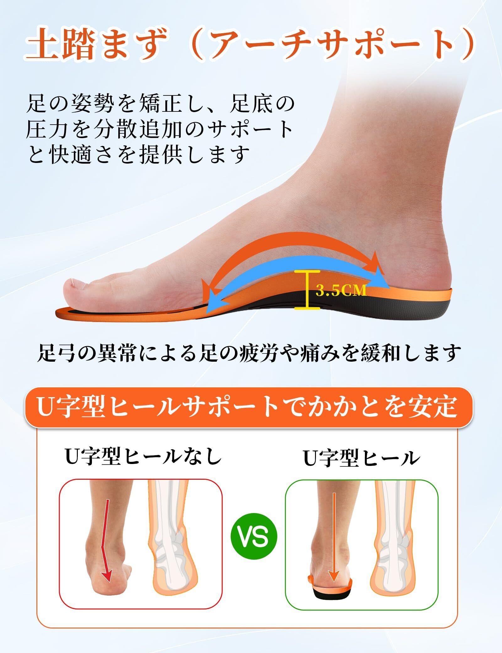 【高性能アーチサポート】インソールには3.5cmのアーチサポートを搭載し、足底のアーチをしっかり支えます。これにより、体圧を均等に分散し、足の安定性と快適性を向上させます。扁平足や足底筋膜炎でお悩みの方にもおすすめです。