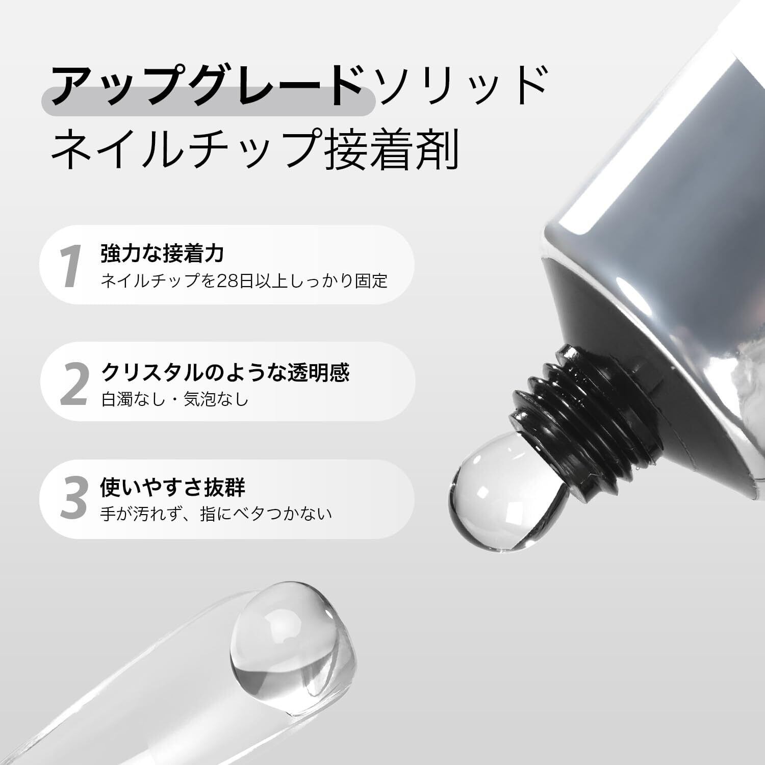 強力な接着力:接着力が非常に強く、ネイルチップとつけ爪をしっかりと固定することができます。