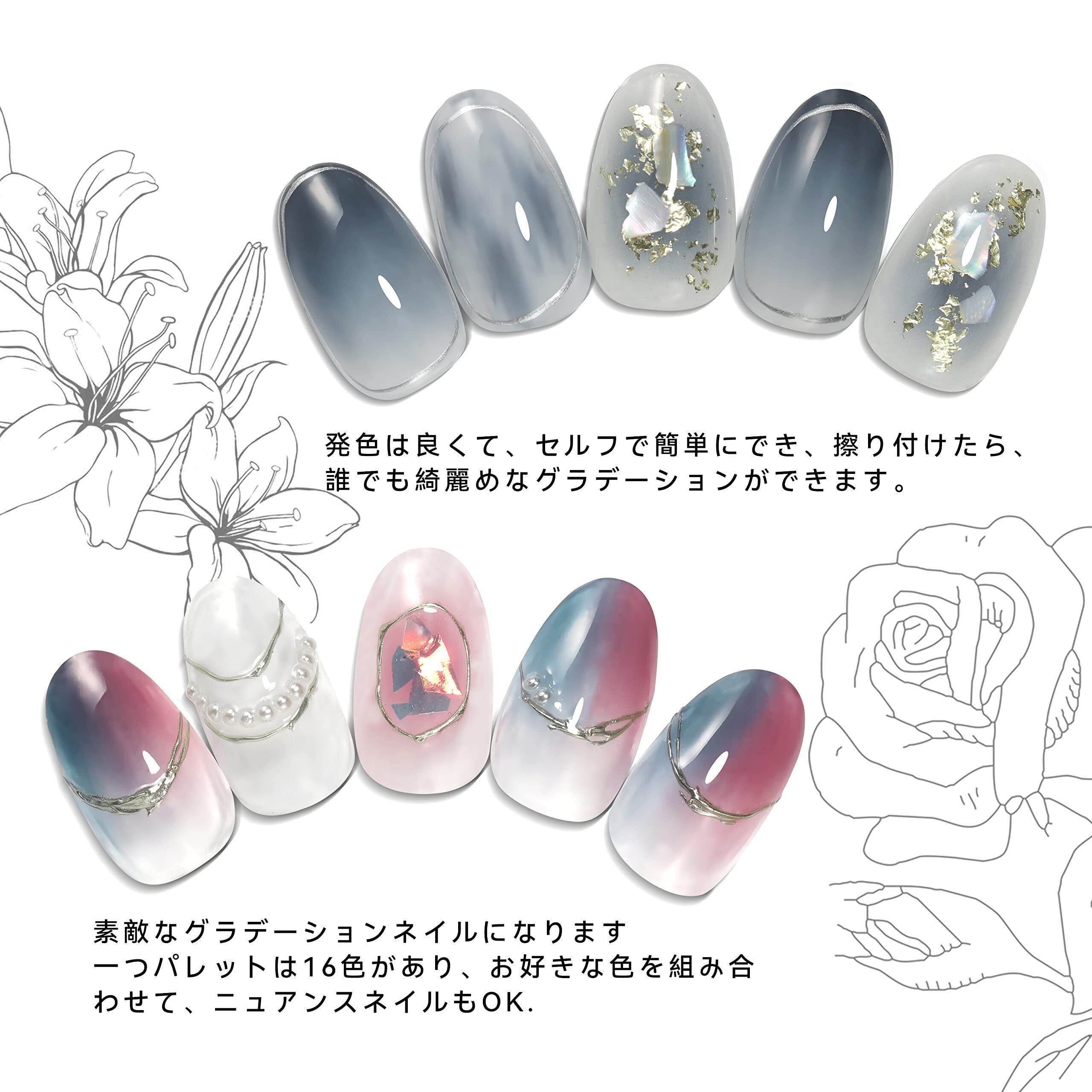 【商品仕様】1ケース:16色入り スポンジチップ*8 厳選した16色は入れてるから、お好きによって色の混ぜるだけで不思議なグラデーションネイルに!スポンジチップ8本付き、変わるなしで使用するのは便利です。