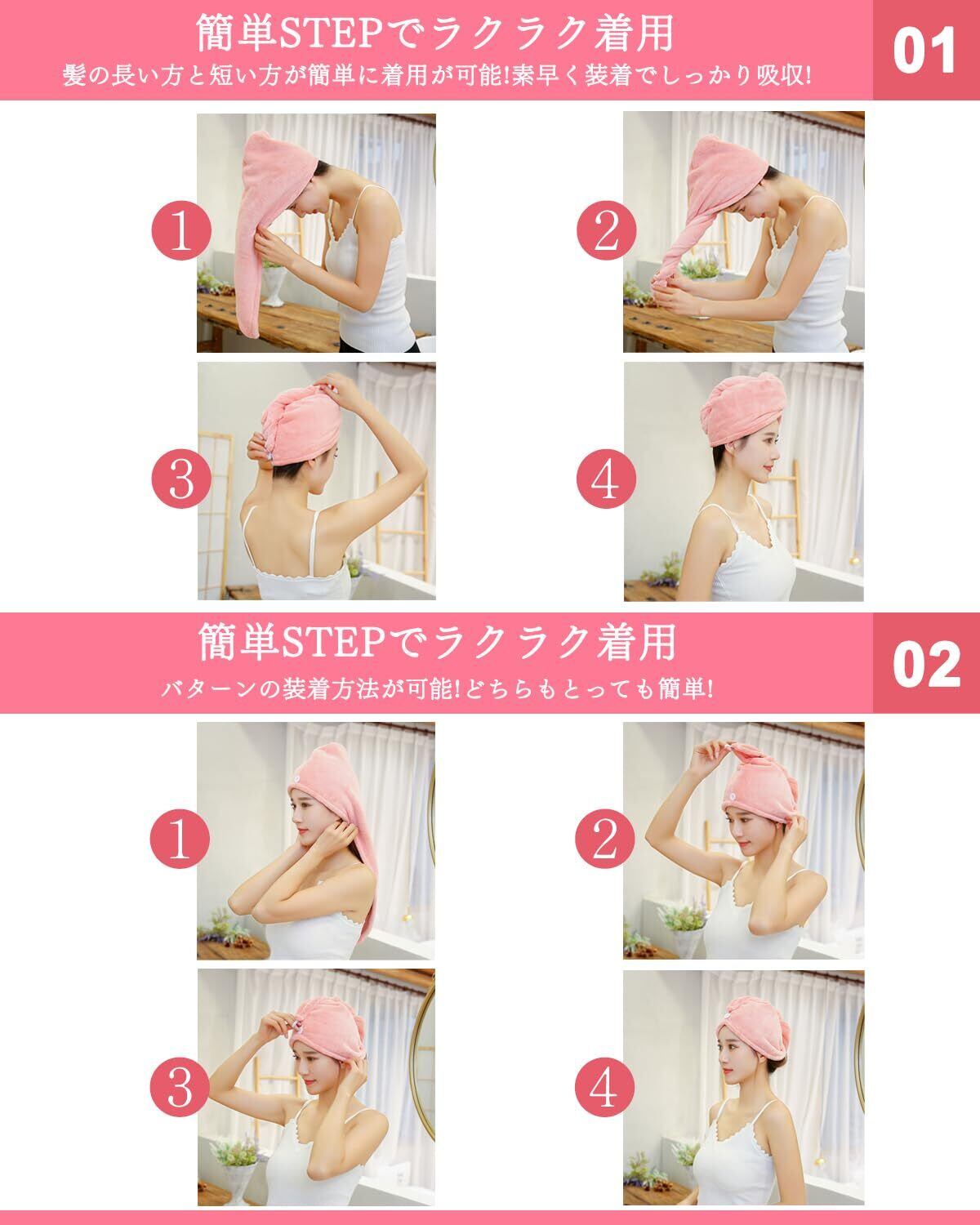 ヘアドライタオル ドライキャップ 【2枚セット】 速乾 髪タオル 長い髪専用 軽量 シャワーキャップ 強い吸水性 お風呂上がり タオルキャップ ふわもこ ヘアターバン ヘアキャップ バス用品(ピンク+水色)