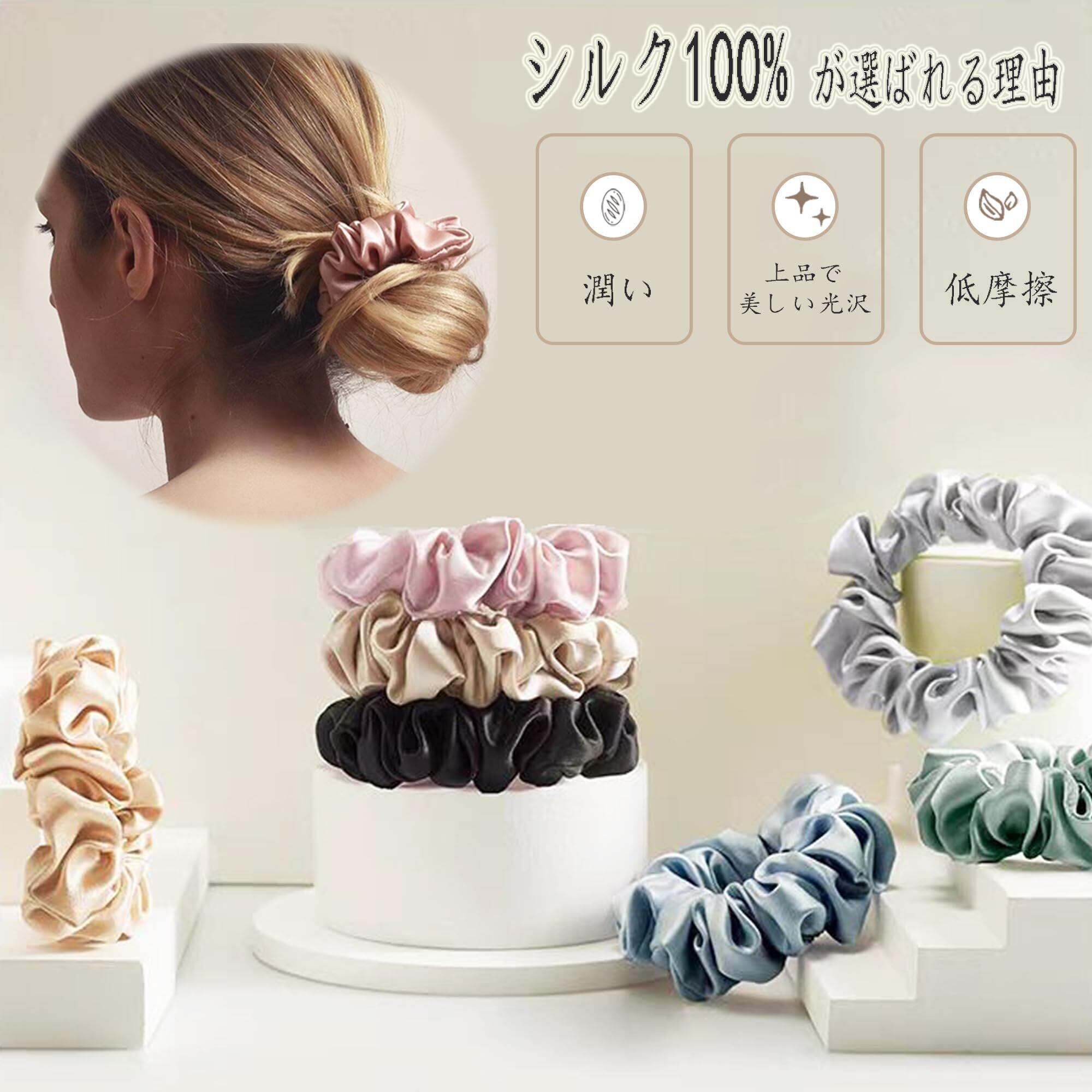 【髪にやさしい100%シルクシュシュ】シルクヘアゴムは美しいシルク特有の光沢があり、髪を結うだけで簡単におしゃれなイメージを演出できます。滑らかなテクスチャーは髪の絡まりを防ぎ、髪へのダメージを最小限に抑えるだけでなく、優雅な印象が目に浮かびます。