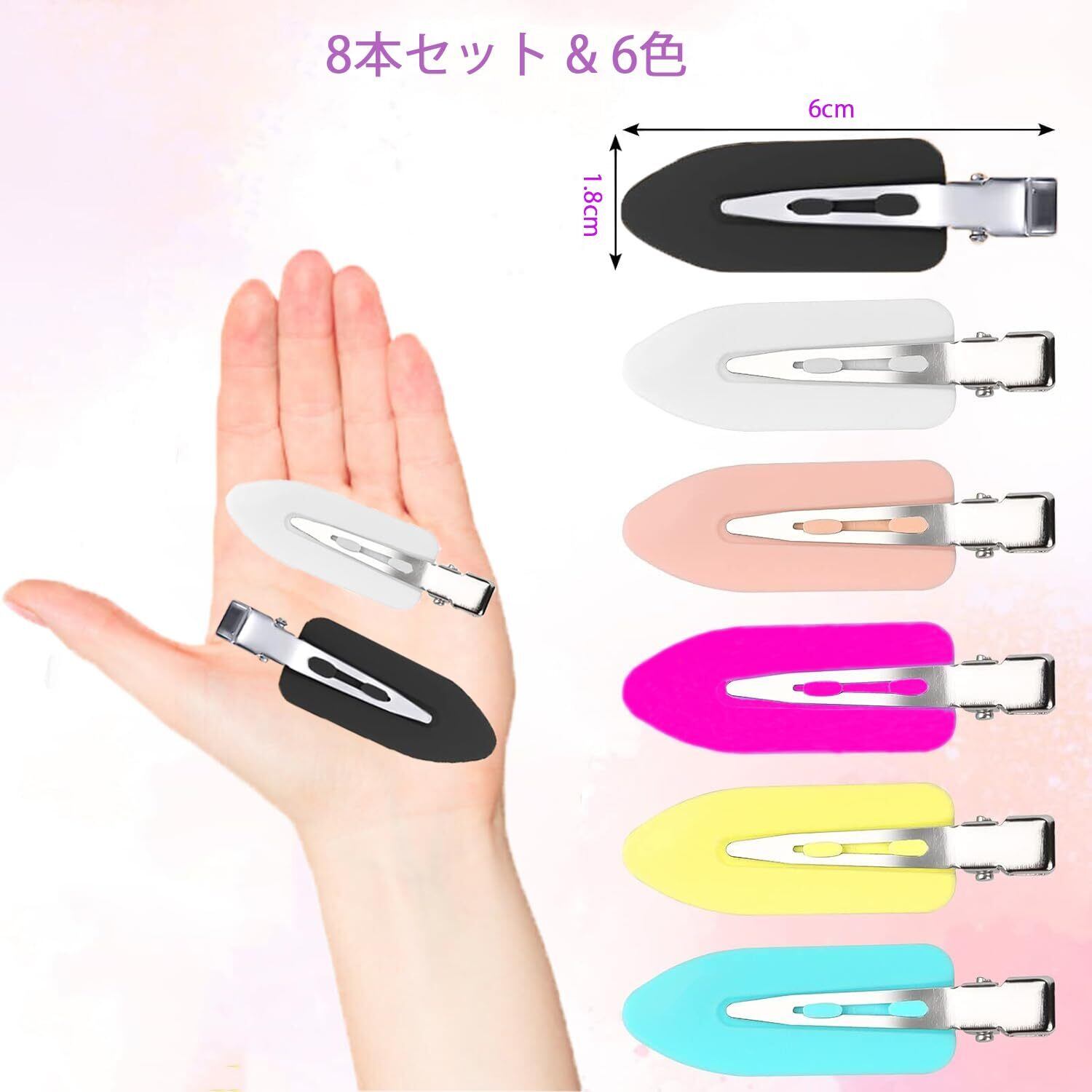 ✨【セット内容】8個セット(6色): ブラック&ホワイト&ピンク&そらいろ&イエロー&ローズレッド。サイズ約6cm*1.8cm。この跡がつかない 前髪クリップは丈夫で耐久性があり、色落ちしにくく、再利用可能。