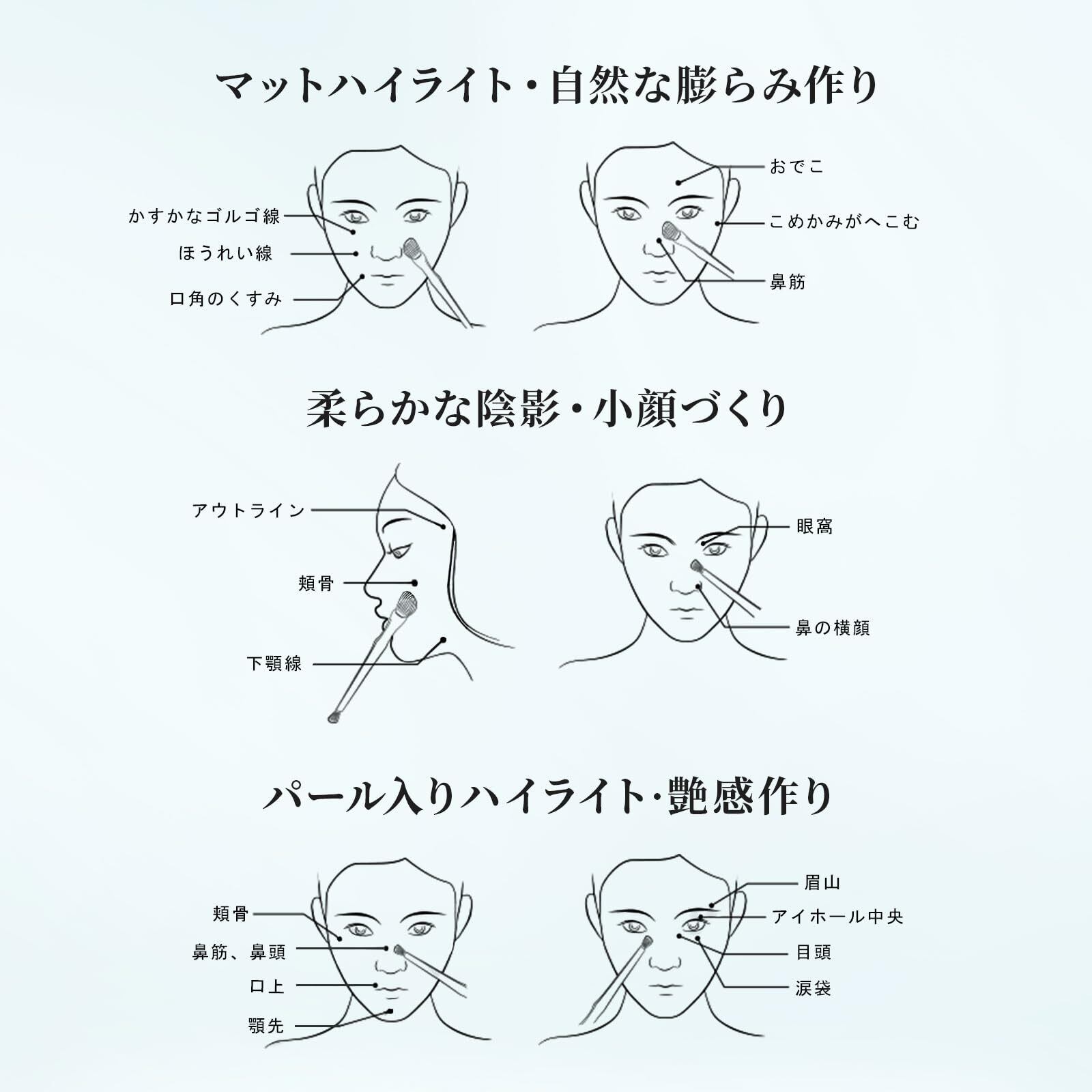 【多彩な使い方】頬骨、下顎線、アウトライン、鼻の横顔、眼窩のところにシャドウを軽くのせると、輪郭が収縮できます。微かなゴルゴ、ほうれい線、口角のくすみ、額、こめかみなどにマットハイライトを入れると、くぼみが改善されます。パールハイライトでチーク、鼻筋、口上、顎先などの部分を明るくすることができて、肌に艶感を与えます。