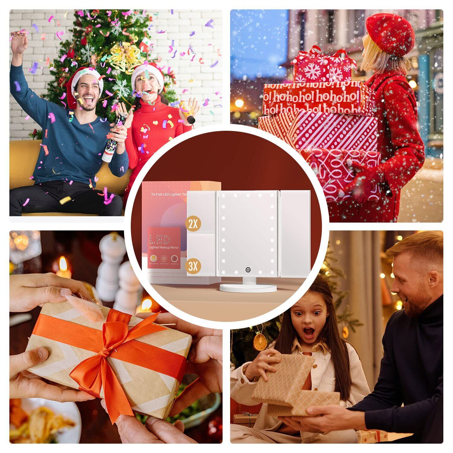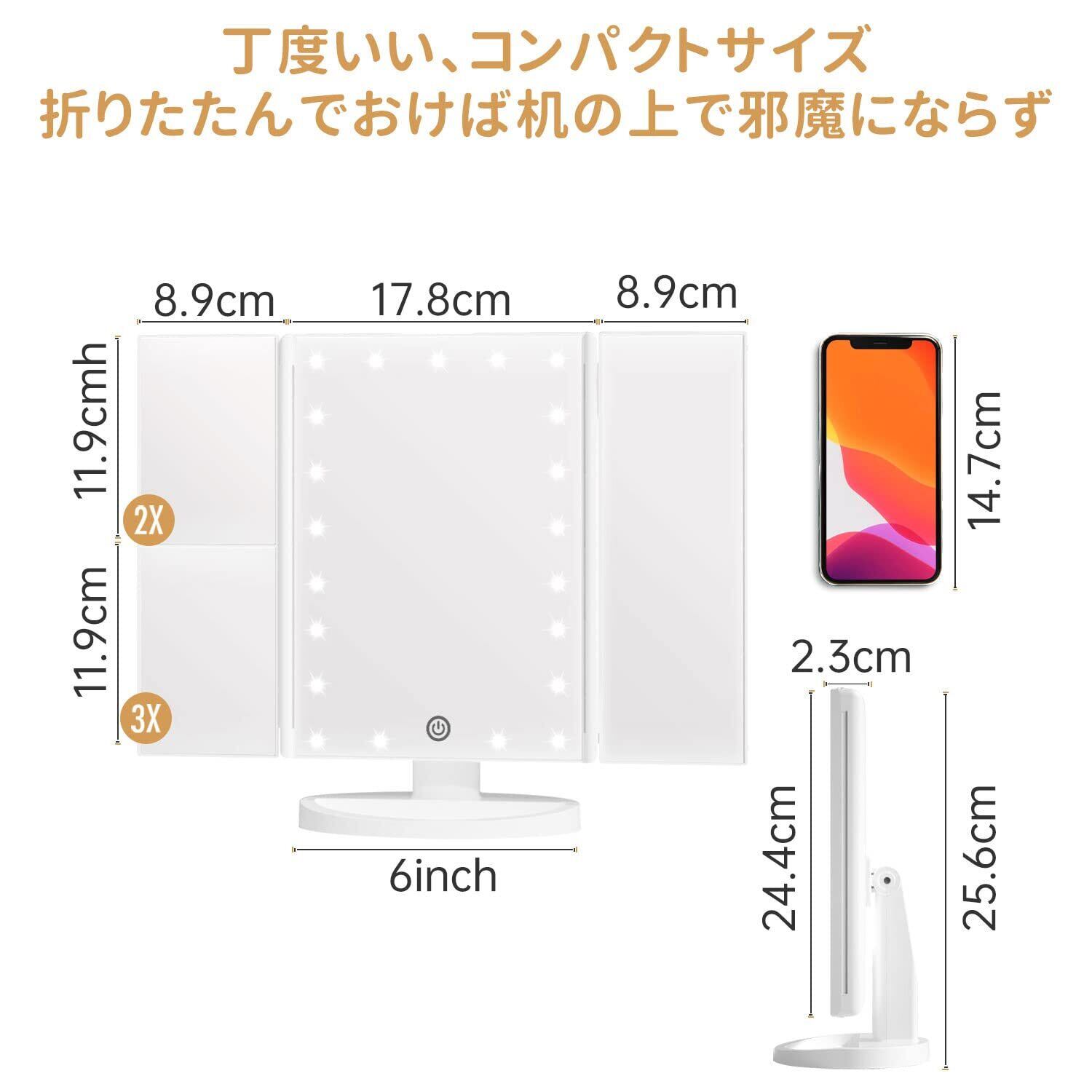 【2倍&3倍の拡大鏡付き】立体三面ミラーですのでお顔の正面だけでなく、横顔や顔全体をしっかり確認することができます。2倍&3倍の拡大鏡により、明るく細かい毛穴の状態を隅々までチェックでき、全体のバランスを確認しながら細やかな化粧をサポートしてくれます。