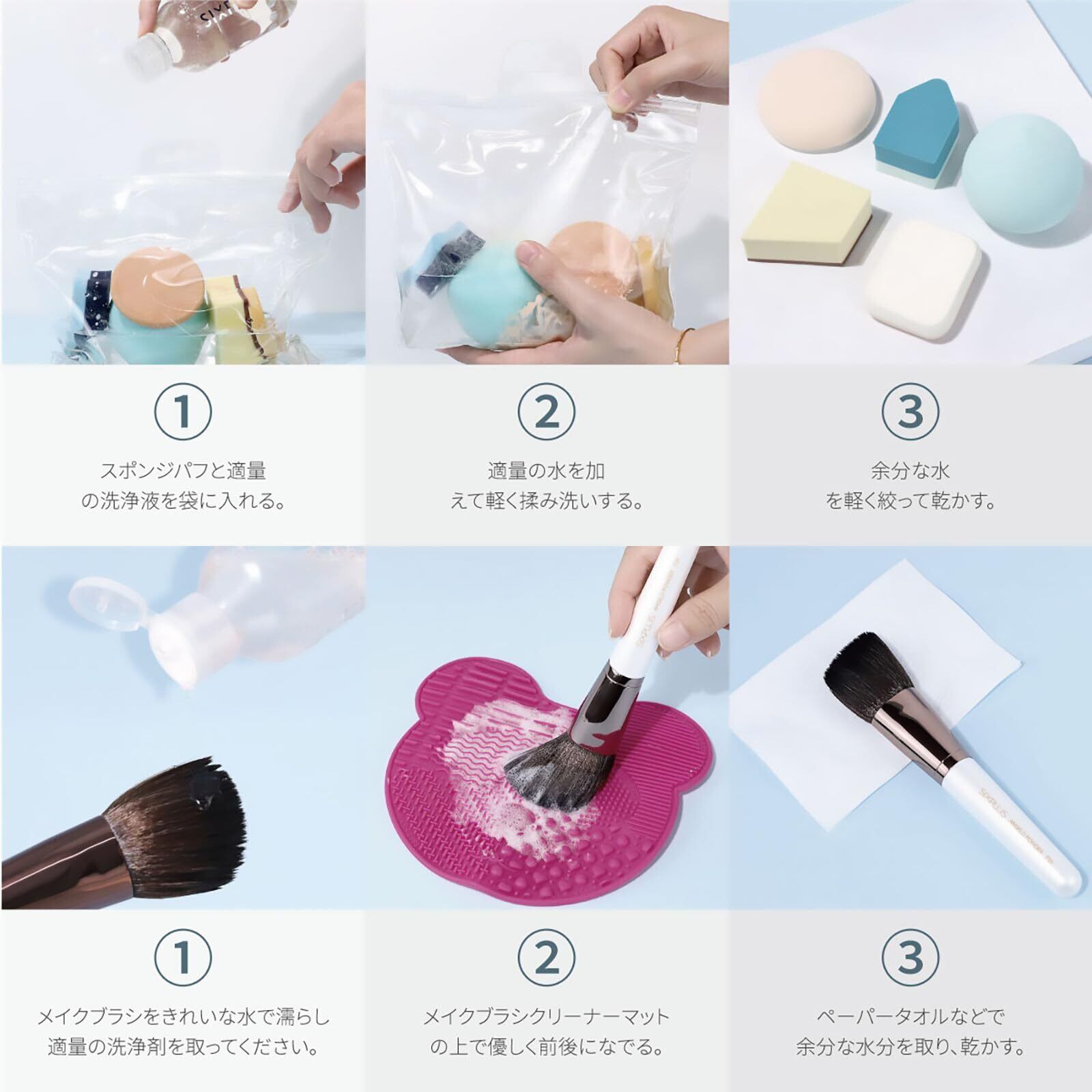 【マルチシーンでの使用】パウダーパフやスポンジパフ、メイクブラシなどのメイク道具の使用に適しています。