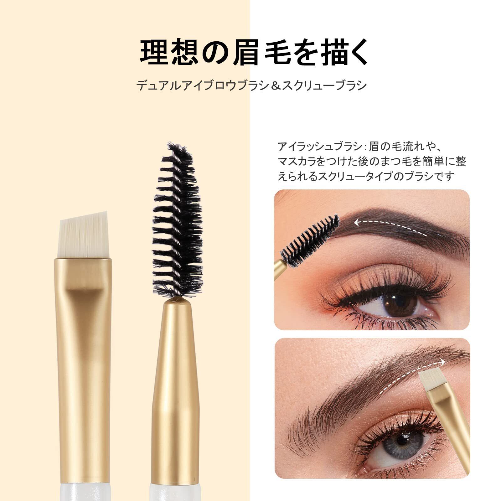【 眉ブラシ&スクリューブラシ】<眉ブラシ>繊細な眉のラインを描くのに適したアイブローブラシ。眉の隙間を埋めながら、ソフトにアウトラインを描くことができます。 眉尻を描く際は、ブラシの先端部分を使って描くとキレイに仕上がります。<アイグルーマー>毛流れを整えるために、下から上に向かってとかすように使用します。また、ブロウジェルの仕上げとして。