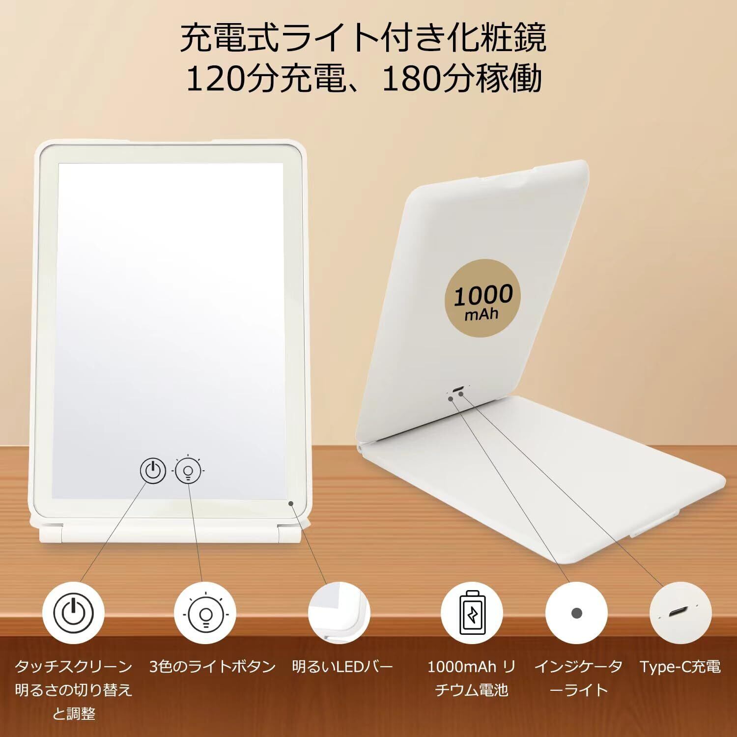 折りたたみ可能な充電式旅行用化粧鏡 手鏡 コンパクト;化粧鏡には大容量の1000mAhバッテリーが内蔵されており、ノートパソコン、モバイル電源、または充電器を使用していつでも充電が可能です。デスクトップミラーとしても、日常の旅行にも使用できます。