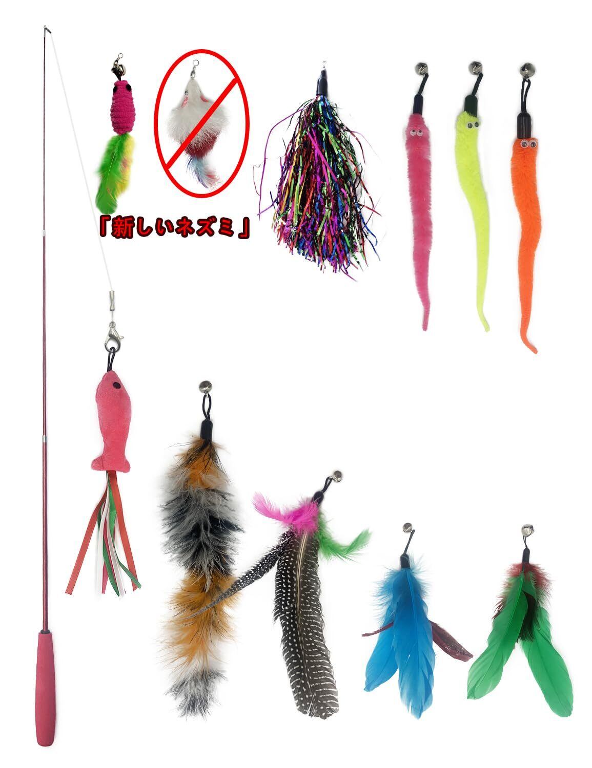 【お得な12点セット】猫のおもちゃ:1本伸縮できる釣り竿、4個天然の羽根、3個疑似毛虫、1個疑似魚、1個疑似マウス、1個リボン、1本の釣り糸。全てのおもちゃに天然羽毛、無毒性の塗料を使用しています!かわいい猫と遊ぶ-とても幸せで幸せなことです!