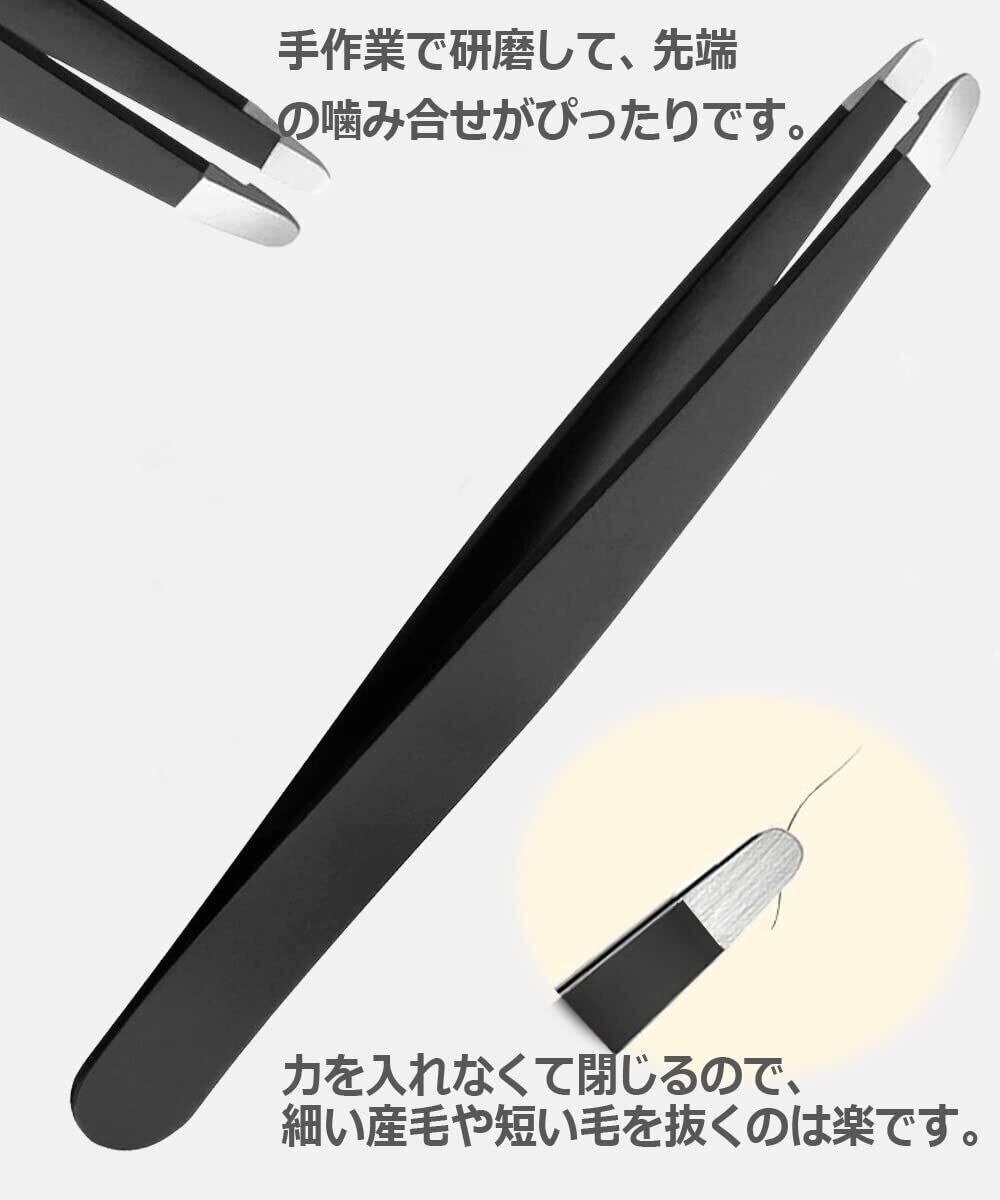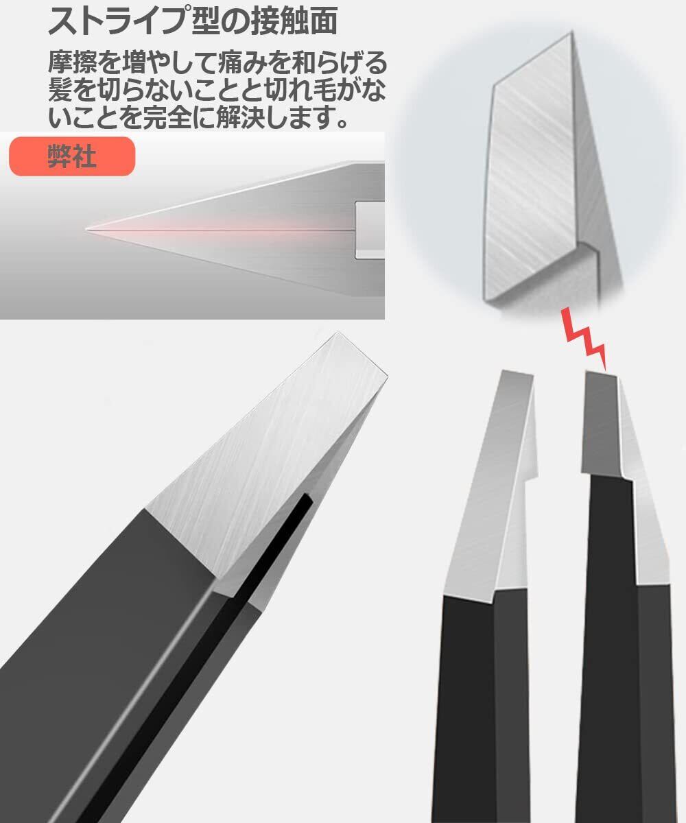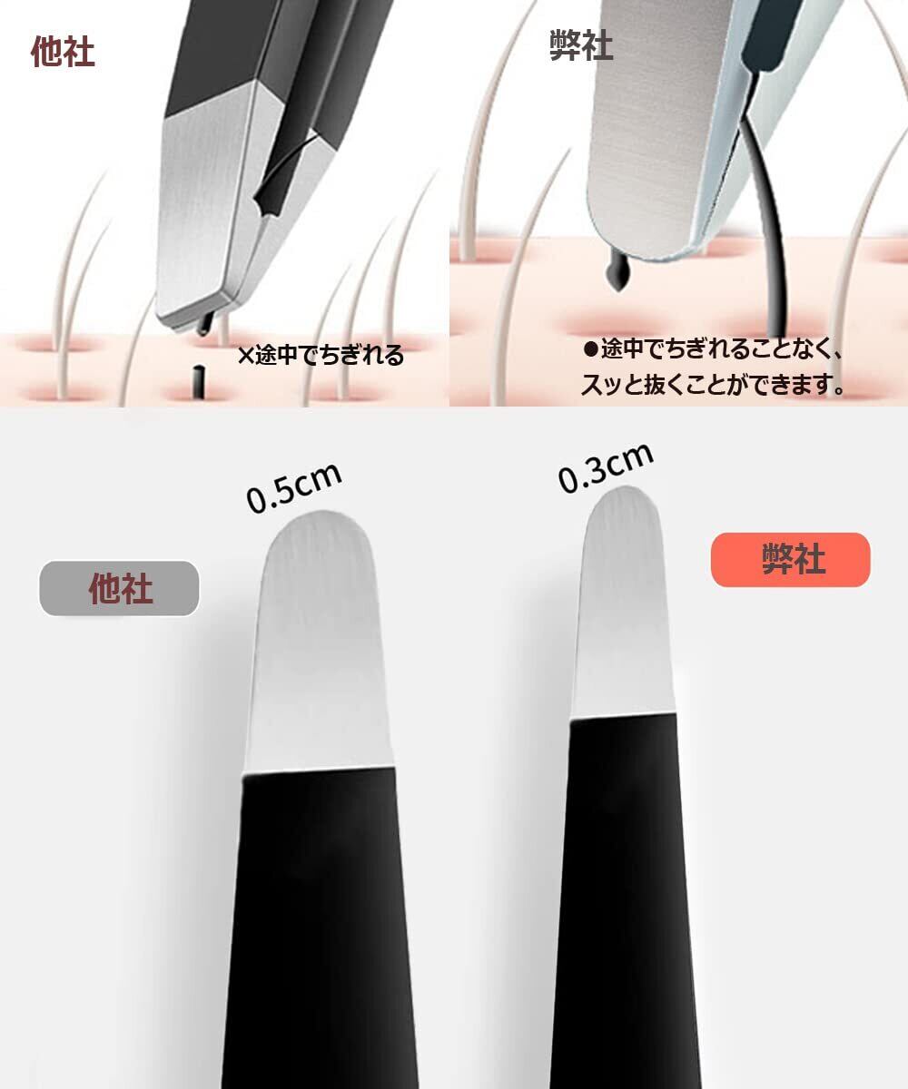 【把握力よい・抜きやすい】 毛抜きピンセットの先端の内側はツイル加工されているので、ズレたり、切れたりしません。 完璧なテンションと先端の精密な咬み合わせにより、眉毛を整えたり、細いヒゲを抜いたりすることができます。髪を根元からつかむのも引っ張るのもラクラクです。