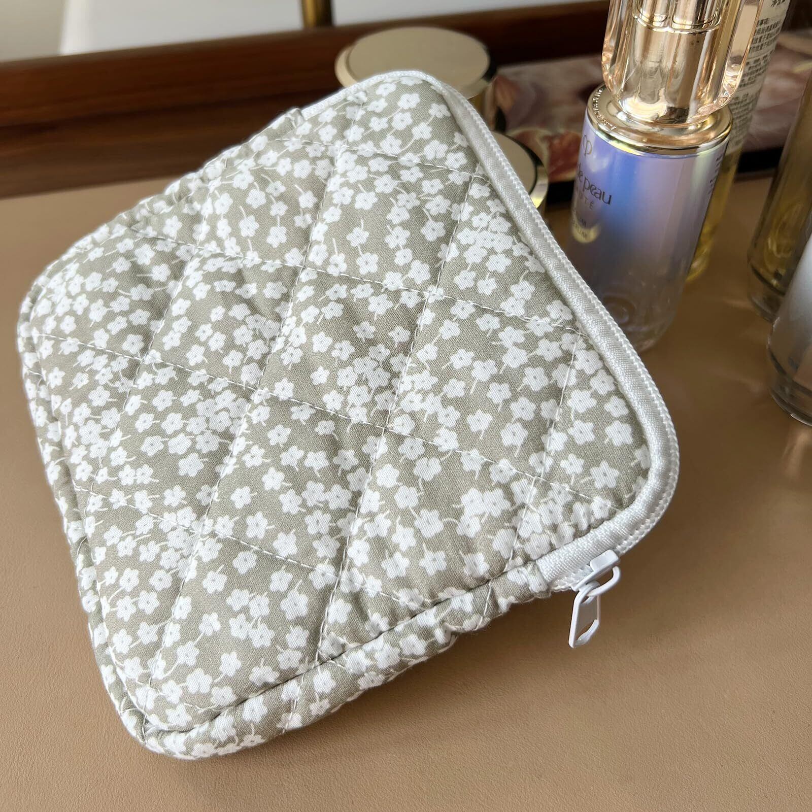 軽量でコンパクトなミニ収納ポーチで、開口部が大きく開くジッパーが付いており、収納に便利です。柔らかいコットン生地は自在に折りたたむことができ、折り目が付きにくくなっています。キルティングデザインがよりおしゃれな印象を与えてくれます。