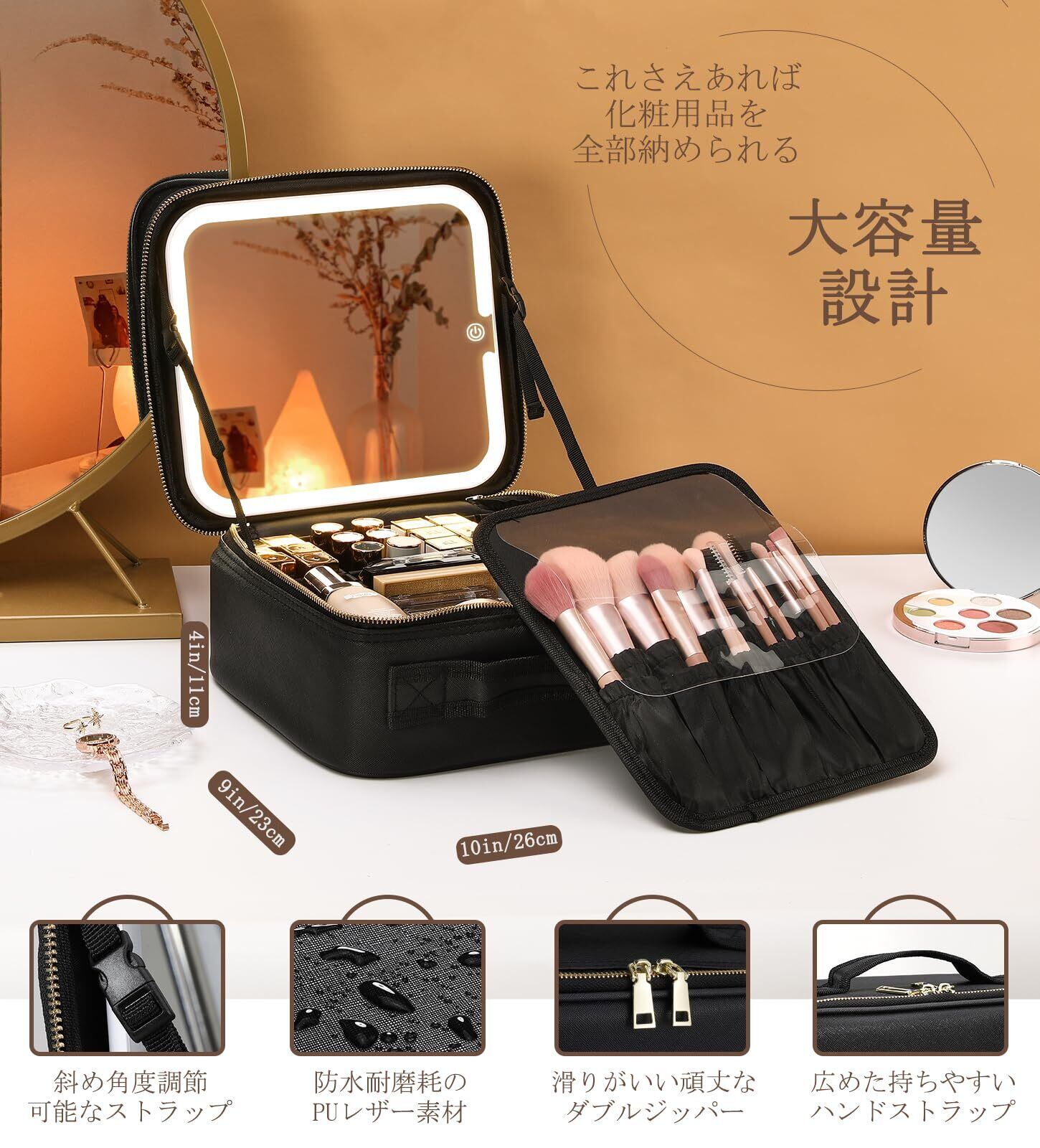 「LEDライト鏡付き」 昼白色・温白色・電球色の3色に切り替えられるLEDライト付き鏡が内蔵され、ボタンを長押しすれば無段階調光できます。USB充電式で在宅、オフィス、車内、外出時などの時にも簡単に充電できます。マジックテープ式固定で、鏡をメイクボックスから外すことは可能です。