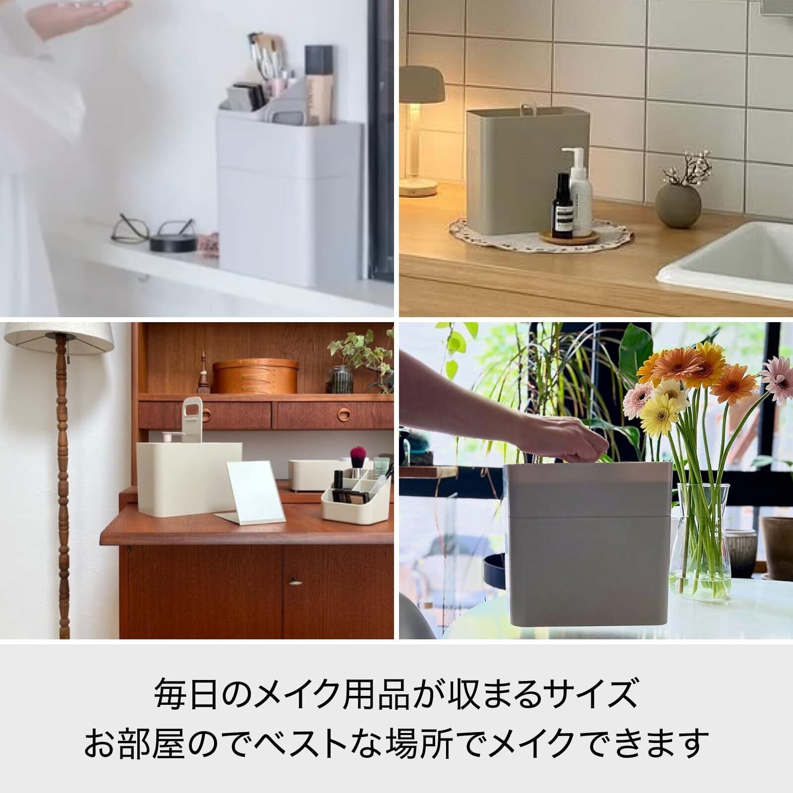 コンセプトは「必要なものだけを収納することで迷わず使いやすくなる」。 整理収納の考え方を踏襲したメイクボックス。 背の高いものから細かなものまで取り出しやすく収納でき、家の中で片手で持ち運びがしやすい。 またシンプルさとスリムなサイズ感は本棚や棚上など、お部屋に馴染むデザインです。