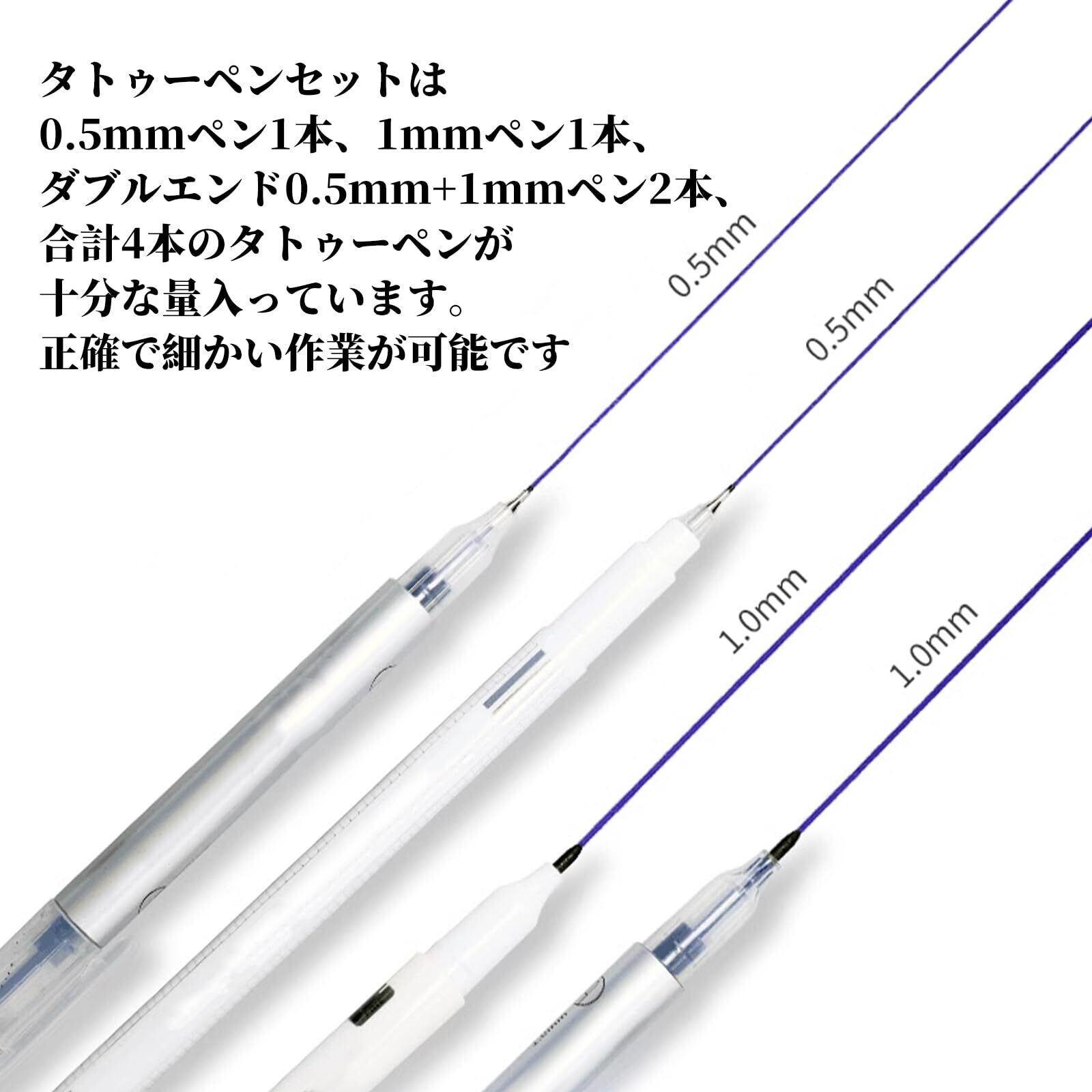 【スキンマーカータトゥーペン】:スキンマーカータトゥーペン4本セットは、タトゥーアーティスト、メイクアップアーティスト、美容愛好家にとって必要不可欠なツールです。 このセットには4本の高品質タトゥーペンが含まれており、タトゥーペンセットは0.5mmペン1本、1mmペン1本、ダブルエンド0.5mm+1mmペン2本、合計4本のタトゥーペンが十分な量入っています。 正確で細かい作業が可能です。