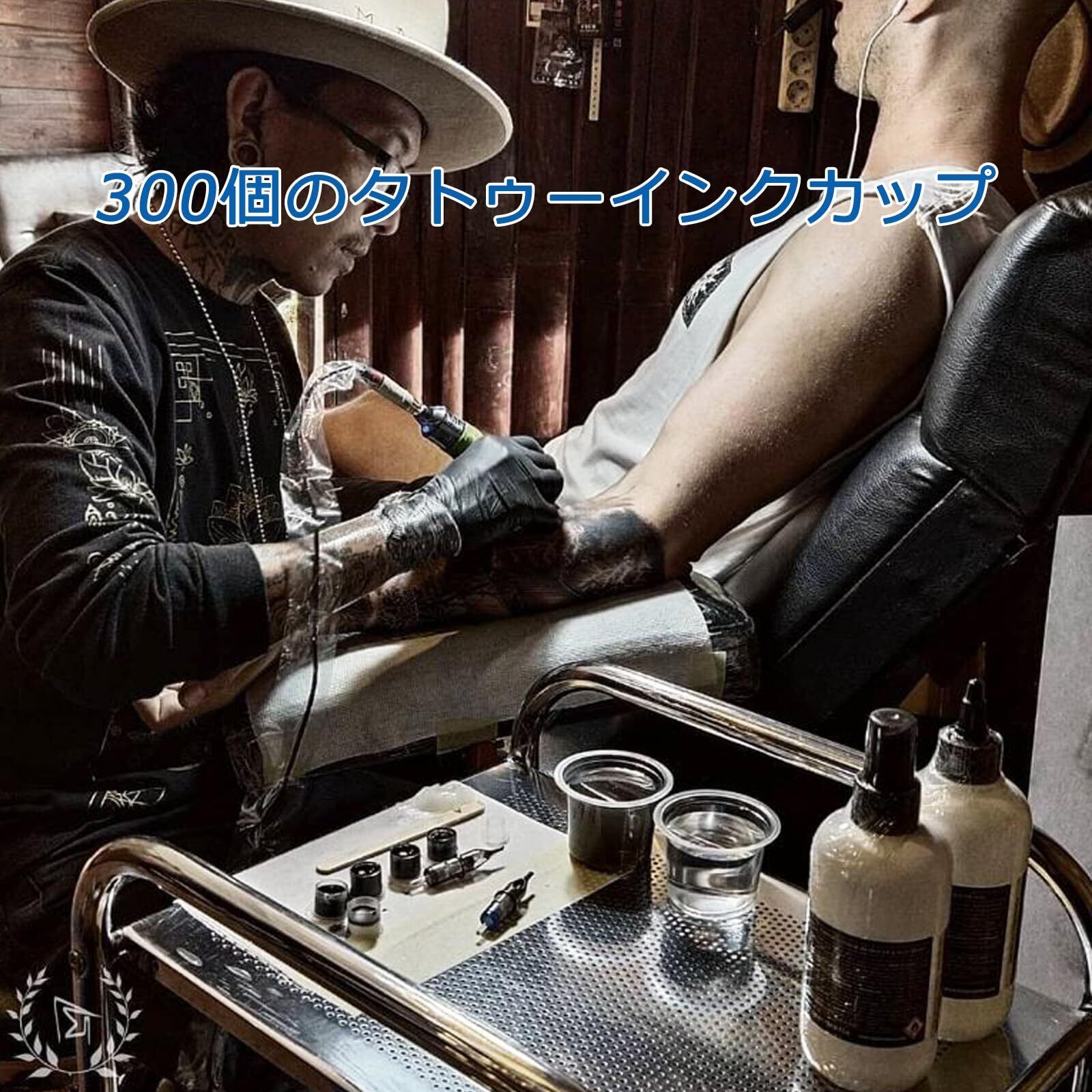 【パッケージとサイズ】 - パッケージには300個の#11mm小型タトゥーインクカップが入っています。内径0.9cm / 0.35インチ、外径1.1cm / 0.43インチ。初心者からプロまで使えるたっぷりとした量です。