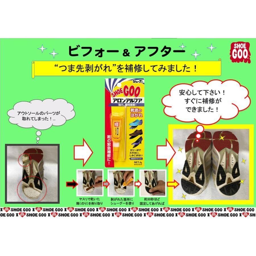 「シューグーアロンアルフア(ゼリー状)」は、瞬間接着材で有名な「アロンアルフア」の東亞合成株式会社の協力により開発された、靴底剥がれなどの貼り合わせに特化した瞬間接着剤です。