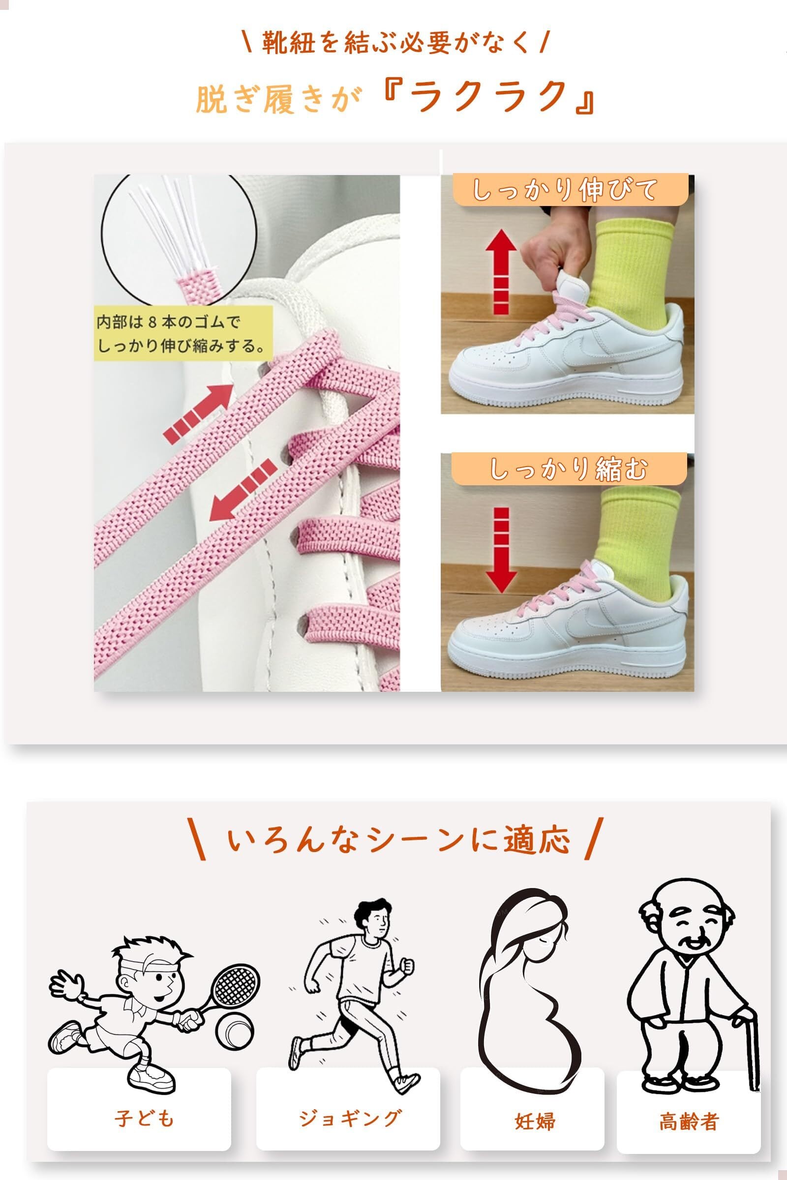 【結ばない、ほどけない】 靴紐を結ぶ必要がなく、伸縮自在のゴム素材で、脱ぎ履きがラクラクです。雨の日や急いでいる時でも、靴ひもがほどける心配がありません