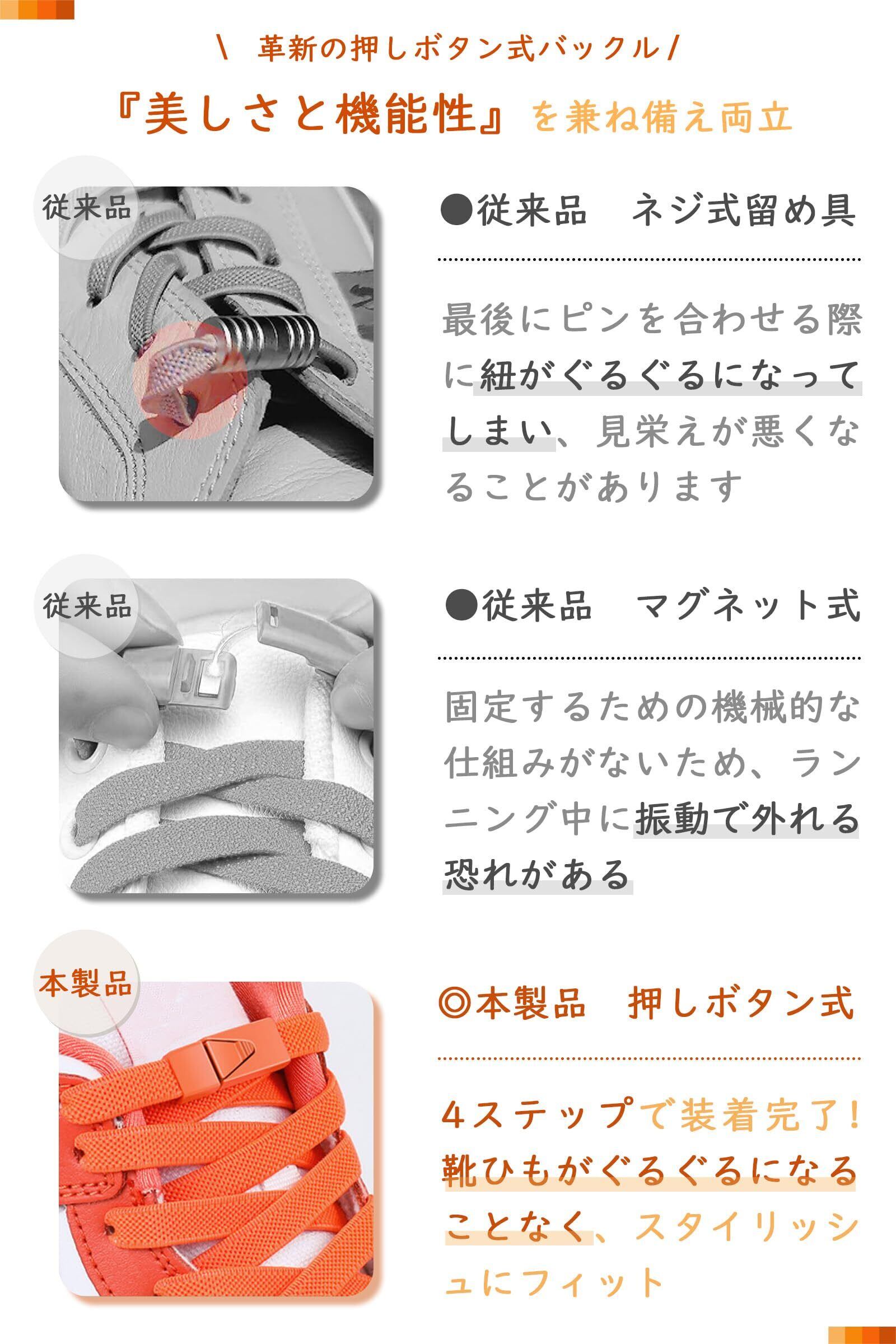 この結ばない靴ひもは、結ぶ必要がなく、伸縮性のあるゴム素材で簡単に脱ぎ履きが可能です。雨の日や急いでいる時でも、靴ひもがほどける心配がありません。2024年新登場の押しボタン式バックルを採用し、従来品のネジ式留め具に比べて取り付けが簡単です。4ステップで装着が完了し、靴ひものねじれを防ぎ、美しい見た目を保ちます。8mm幅の平ひもには8本のゴムが内蔵されており、耐久性が高く引っ張りにも強い仕様です。金属製のバックルを使用しているため、激しい運動でも外れにくく、安心です。また、靴ひもの長さは約100cmで、穴が14個以下の靴に対応可能。弾力性があるため、必要に応じて長さを調整でき、短い靴ひもや子供用の靴にも対応します。スニーカー、ブーツ、ドレスシューズなどあらゆる種類の靴に対応可能な全18色のバリエーションから選べ、バックルと靴ひもが同色で、カラフルなひもを靴のアクセントカラーとして使うことで、オリジナルのコーディネートを楽しむことができます。