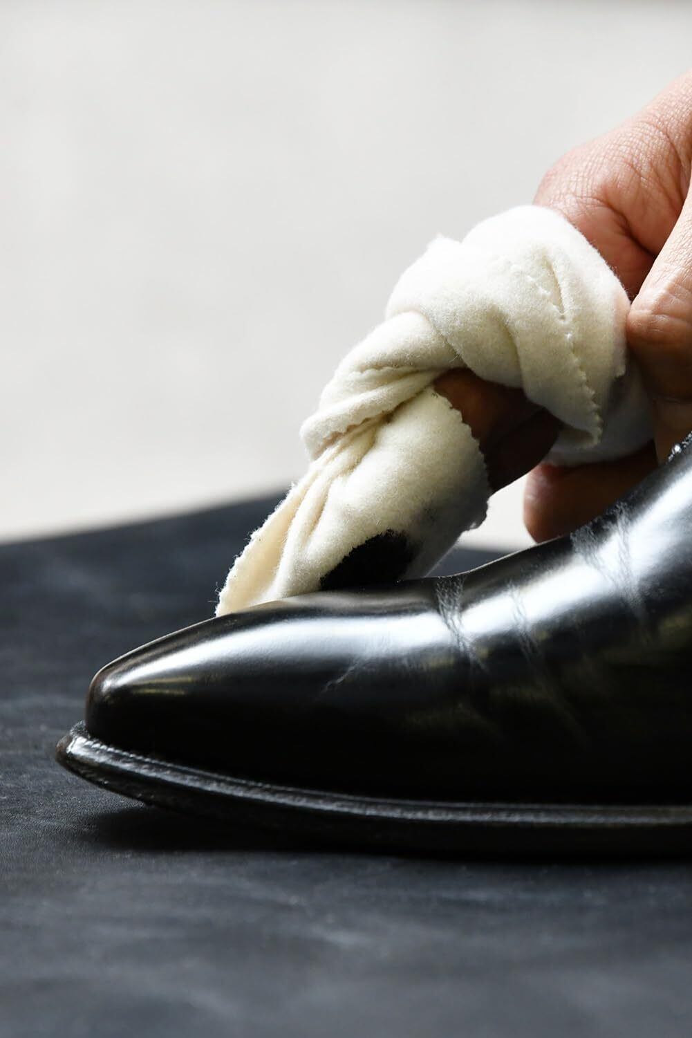 つま先や踵の鏡面磨き用に使用する場合は、何日か缶の蓋をあけたままで乾燥させドライワックス化させますと、更に簡単に光らせやすくする事も可能です。