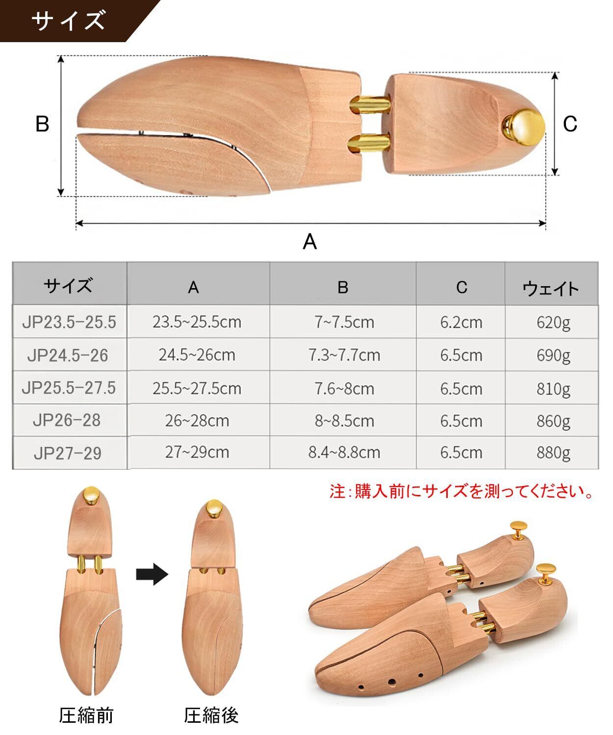 【ハンドメイド】私たちのシューキーパーは、慎重に手作業で製作されており、そのため掲載寸法より、若干のずれがある場合がございます。適合サイズにつきましては、メーカーや靴の種類、使用頻度により異なりますので、ご使用になる靴の内寸を実測し、サイズをお選びください。