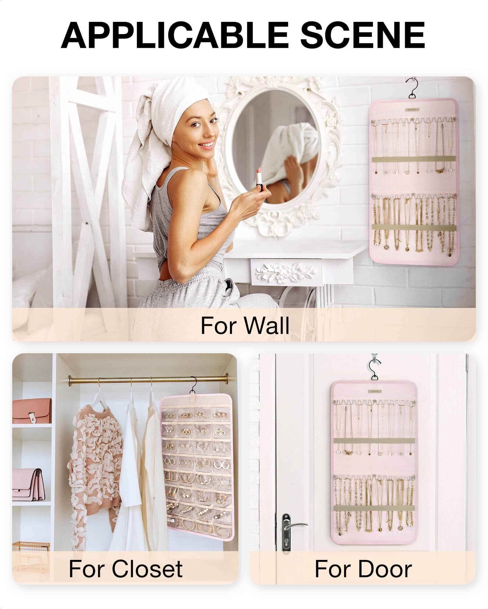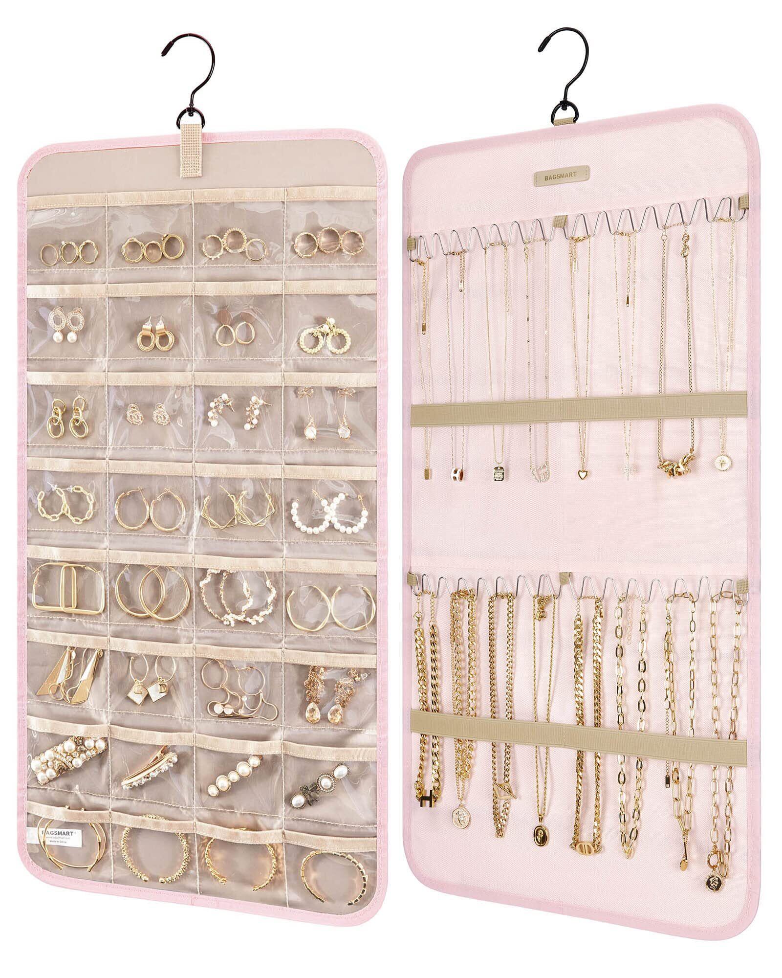 BAGSMART 吊り下げジュエリーオーガナイザー 収納ロール ハンガー付き メタルフック 両面ジュエリーホルダー イヤリング ネックレス クローゼットのリング 壁 ドア Mサイズ ピンク