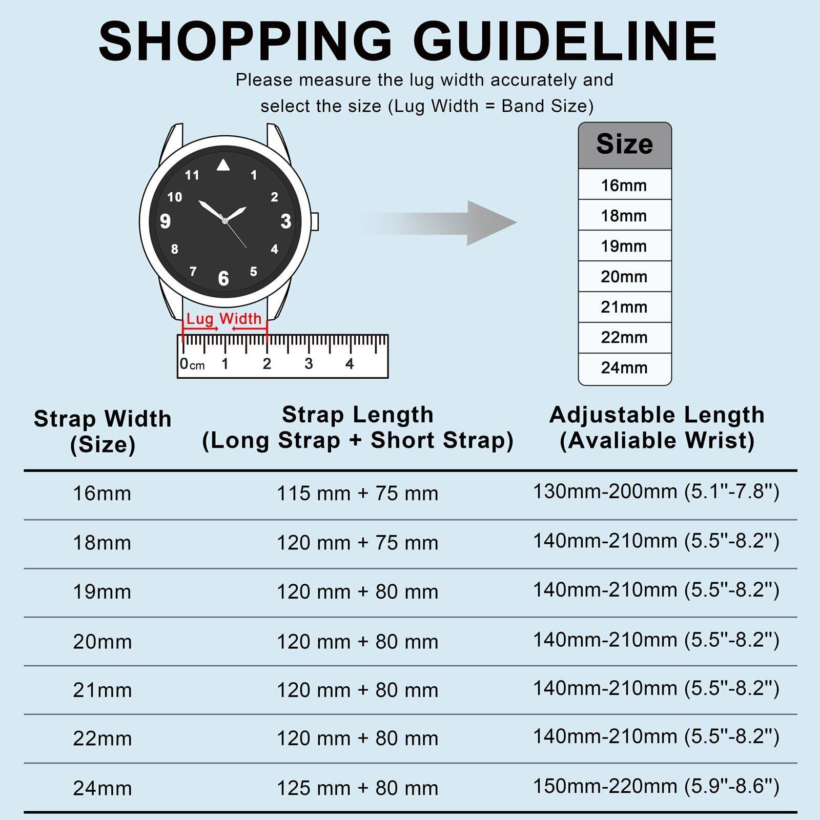 バンド幅(サイズ):このバンドには5種類の幅があります:16mm、18mm、19mm、20mm、21mm、22mm、24mm。ラグ幅は16mm、18mm、19mm、20mm、21mm、22mm、24mmの伝統的な腕時計とスマートな腕時計と互換性があります、正確に腕時計のサイズを測定してください