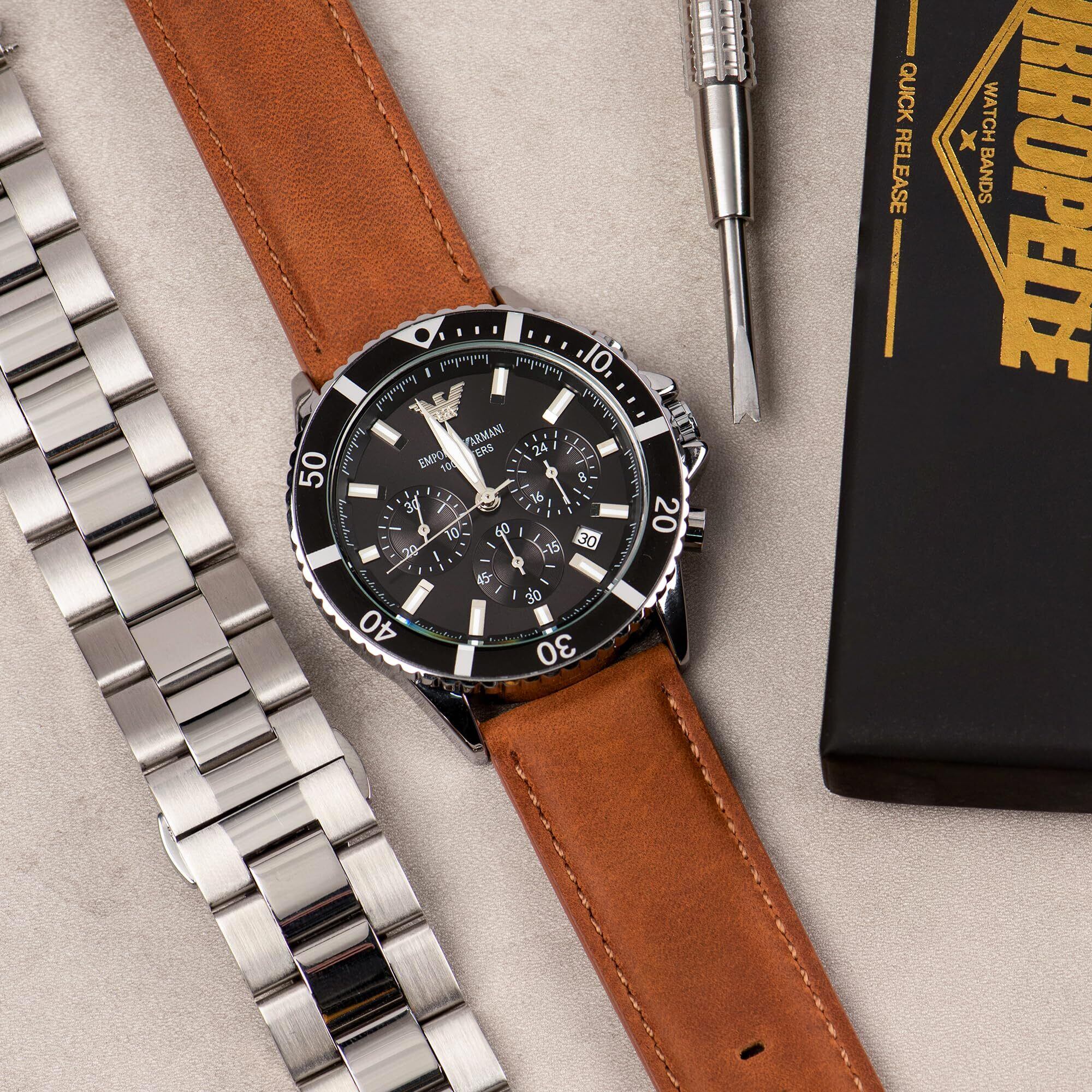 ヴィンテージスタイル、クレイジーホースレザーとダークヌバック: 厳選された最高級のクレイジーホースレザーは、革を曲げると自然にひび割れが生じます。時間の経過とともに自然な風合いが生まれますが、こうした単純な欠陥がどんな時計にも豊かな質感を加えます。裏側にはダークブラウンのヌバックライニングを施し、肌触りが非常に柔らかく、滑りを最小限に抑えながら理想的な快適さを提供します。この組み合わせにより、エレガントでクラシックなレトロスタイルが生まれ、手首に快適に着用できます。