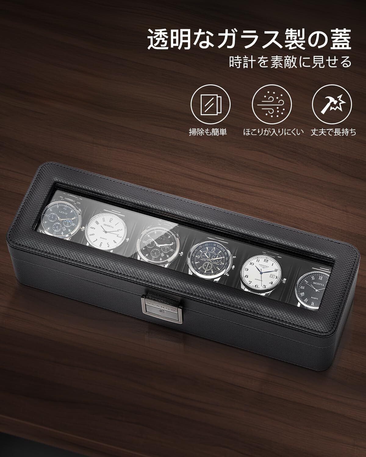 透明ガラスの蓋 - この時計保管ボックスの透明の調整ガラスの蓋は、時計を一瞬で見つけ出し、見つけることができ、またダストから保護することができます。