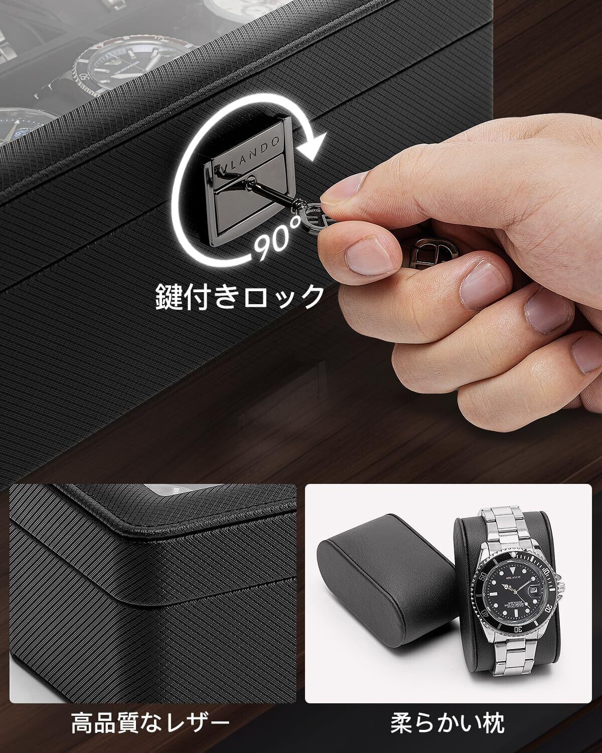 精巧な作工 - Vlandoの時計ケースは、質の高い細菌皮革と皮革の内側を使用して作成されており、整いの良いステッチングと高品質のロック(鍵を含む)を特徴としています。ロック可能な時計ボックスオーガナイザーは堅牢で耐久性があり、貴重品を安全に保管します。