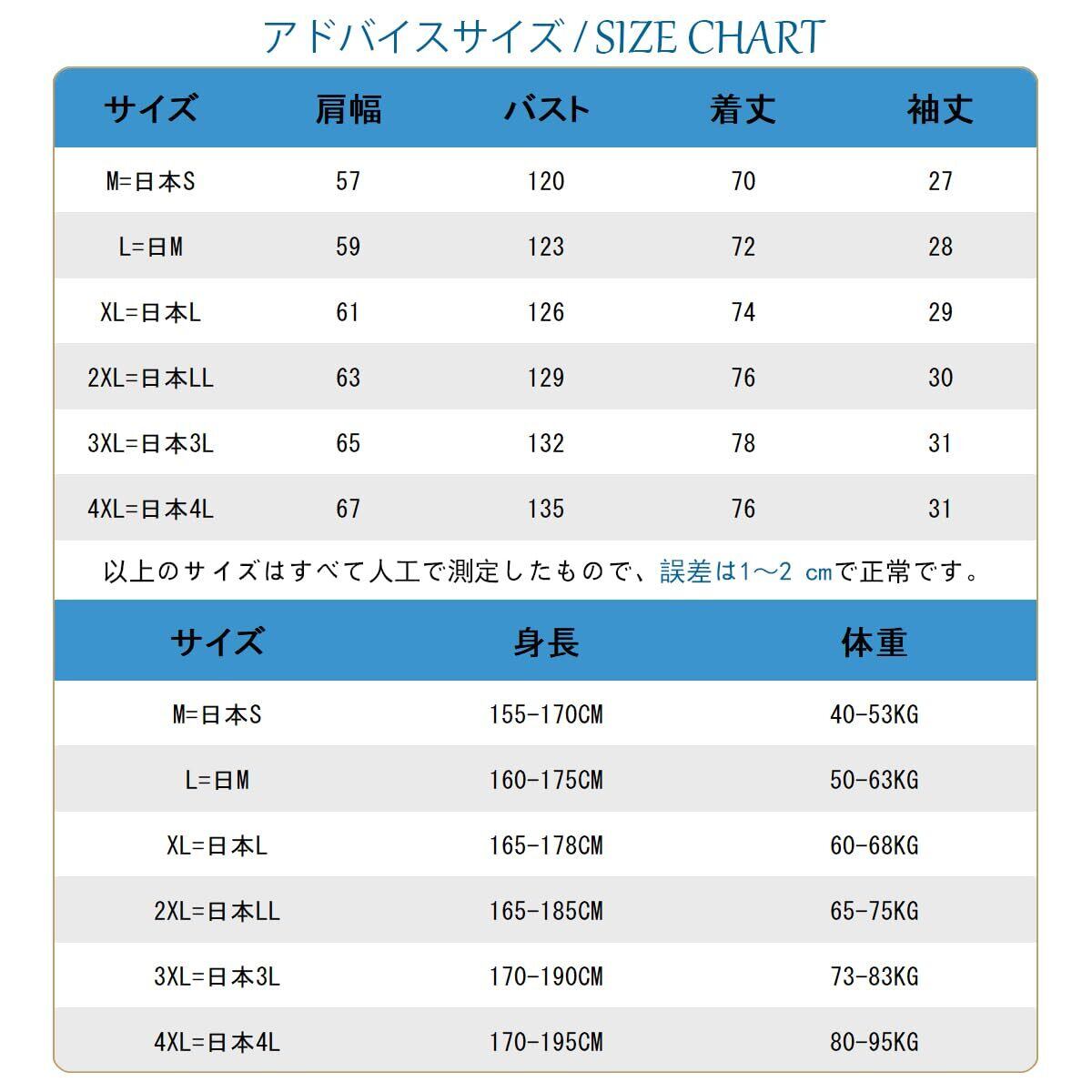 サイズの参照:M =日本S、身長の目安:155-170cm、体重:40-53kg。L =日本M、身長の目安:160-175cm、体重:50-63kg。XL =日本L、身長の目安:168-178cm、体重:60-68kg。2XL =日本LL、身長の目安:165-185cm、体重:65-75kg。3XL=日本3L、身長の目安:170-190cm、体重:73-83kg。4XL=日本4L、身長の目安:170-195cm、体重:80-95kg。※例:普段Mサイズを着用されている方はLサイズを購入して頂くのがオススメ。