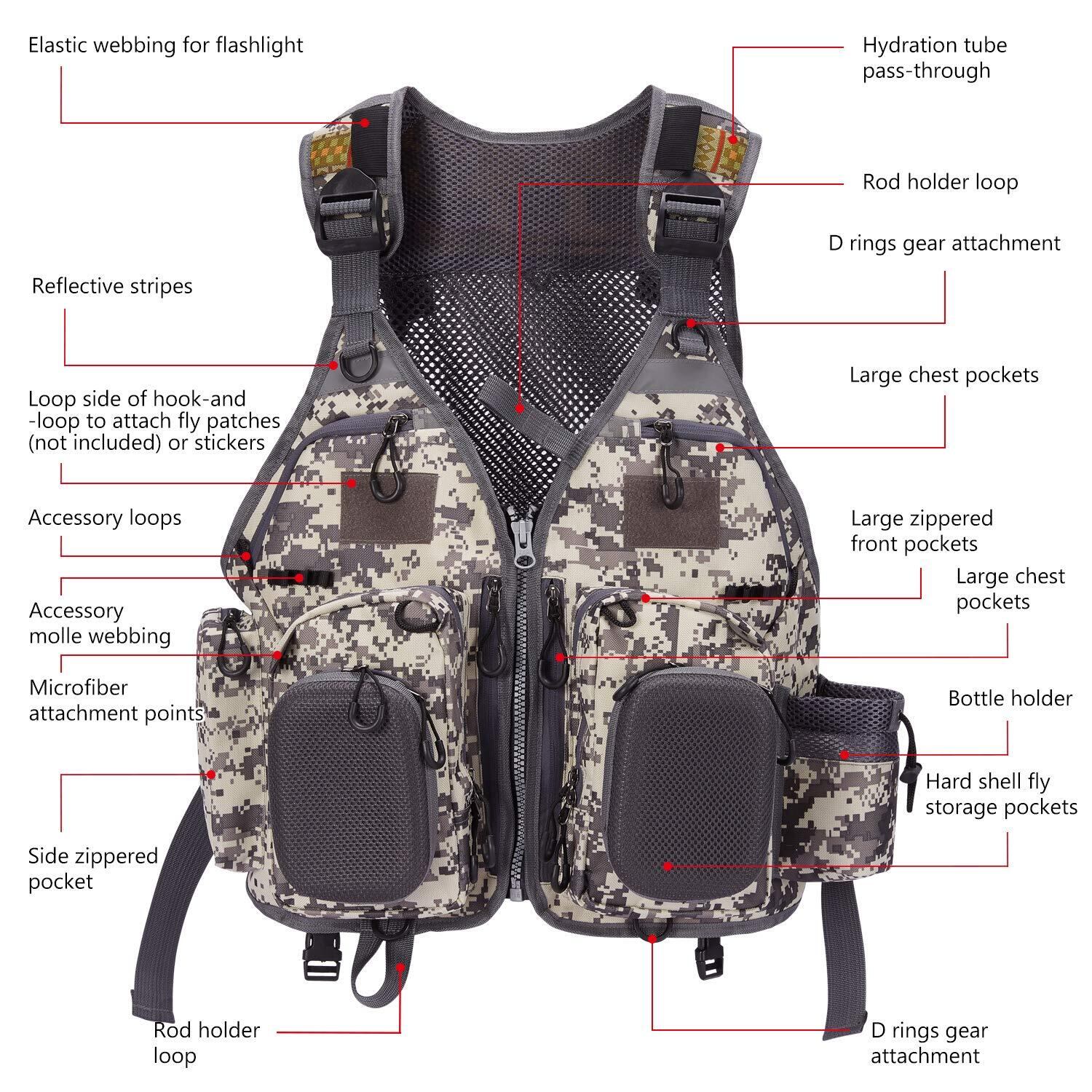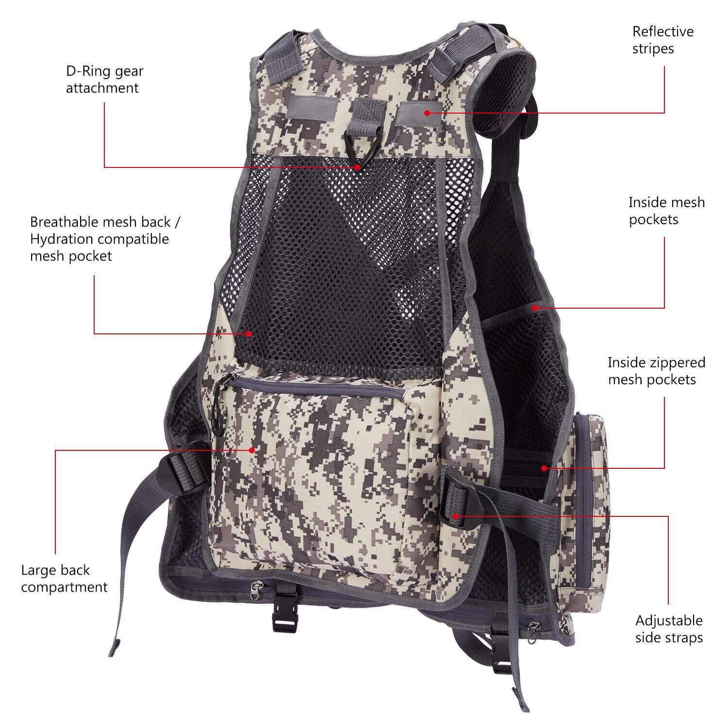 「√メッシュ素材・速乾と通気性」:フィッシングベストの背中部分はメッシュのデザインで、通気性がありまして、暑い天気でもアウトドアスポーツを楽しむこともできます。