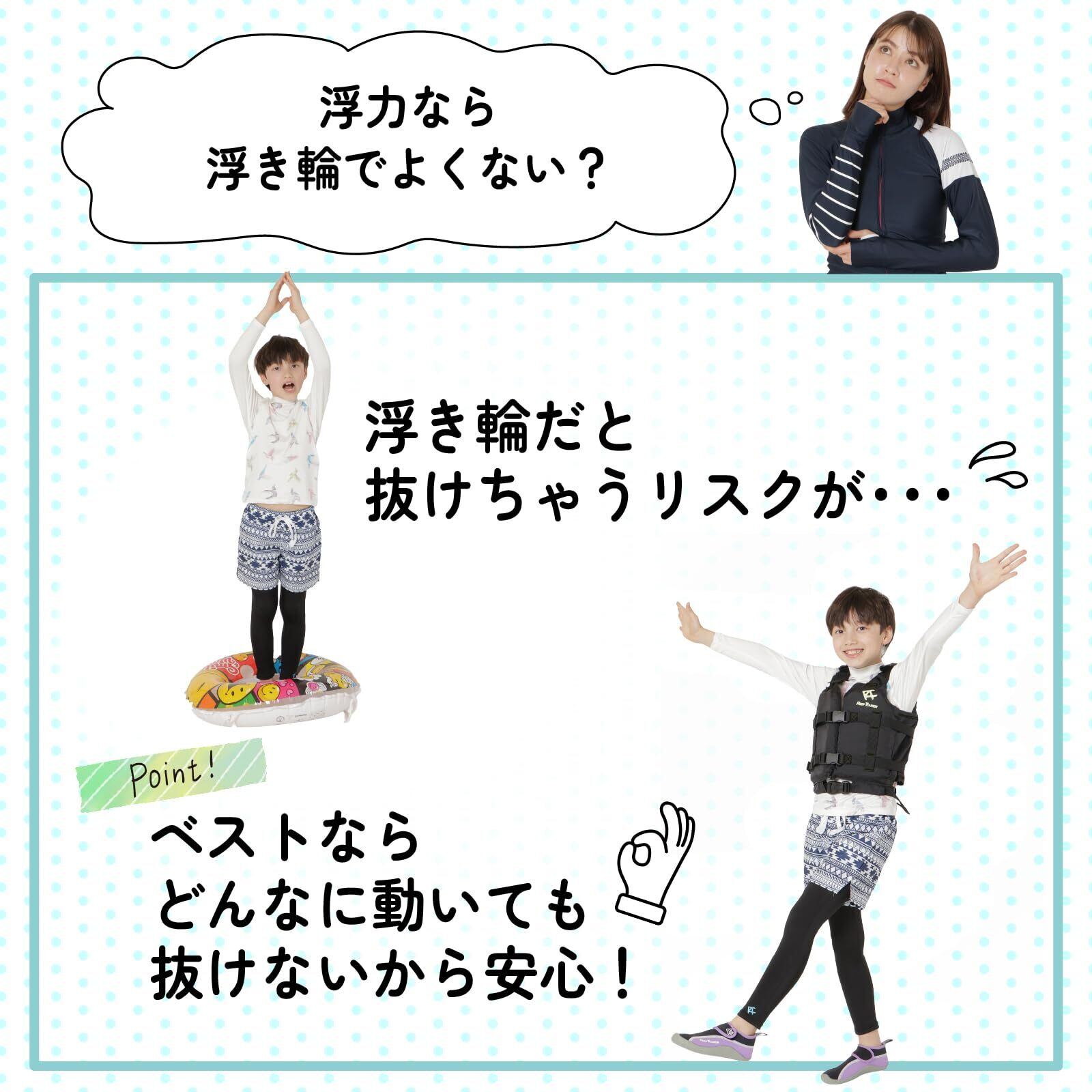 【浮き輪よりも泳ぎやすい! 】「浮き輪より泳ぎやすい」というお声をいただいております! 海の中でも簡単に着脱できる浮き輪は便利ですが、シュノーケリングのように長時間泳ぐ際には体にフィットして自由に動けるシュノーケリングベストがおすすめ! 浮き輪だと体が抜けてしまうといったこともありますが、シュノーケリングベストであればしっかりフィッティングすればその心配は無用。さらにつけっぱしにできるので、不意な事故の抑制にもつながります。浅瀬での水遊びには浮き輪、しっかり泳いだりシュノーケリングをする際はシュノーケリングベストなど、用途にあわせてお選びいただくと、より海や川のレジャーをお楽しみいただけると思います。