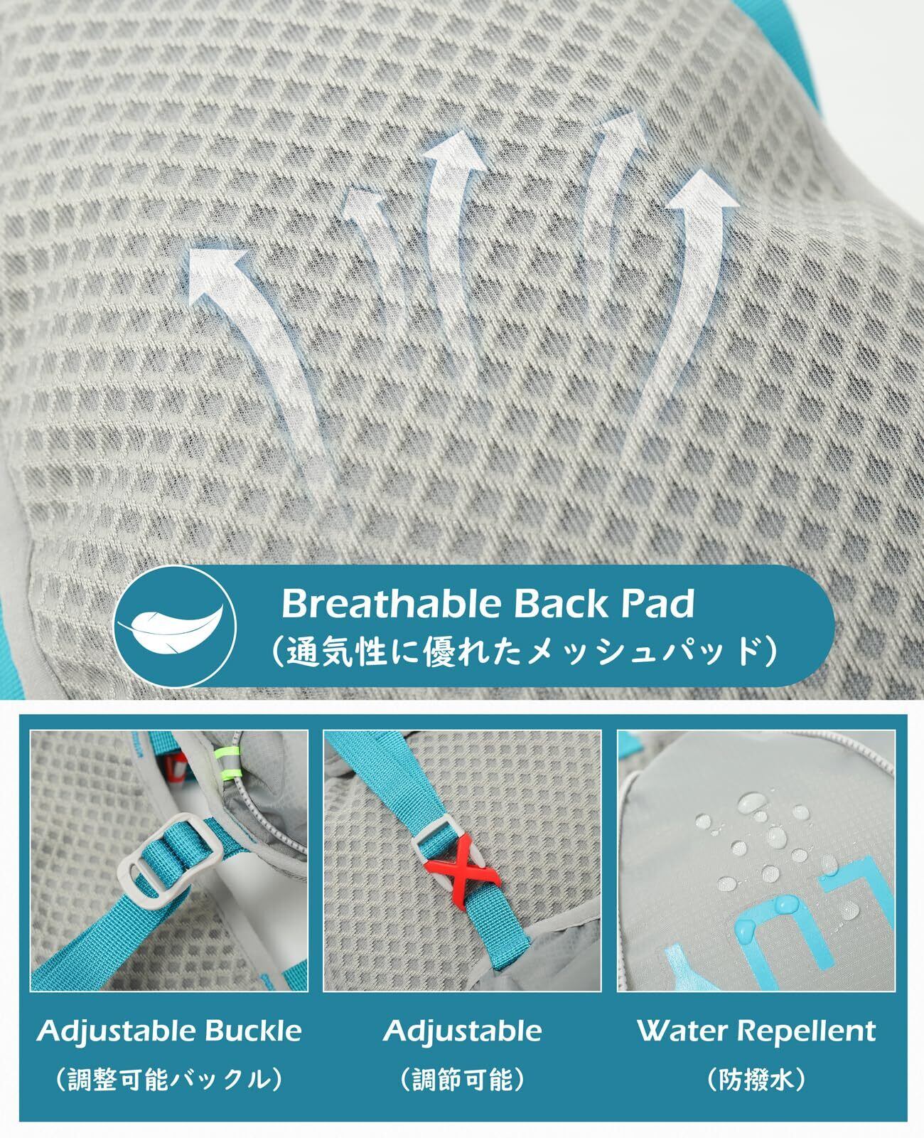 優れた通気性:ランニングリュックのショルダーベルトと背面パッドには通気性に優れた薄型メッシュ素材を採用。汗や湿気をすばやく逃がし、長時間のランニングや登山でも蒸れずに快適な着用感をキープします