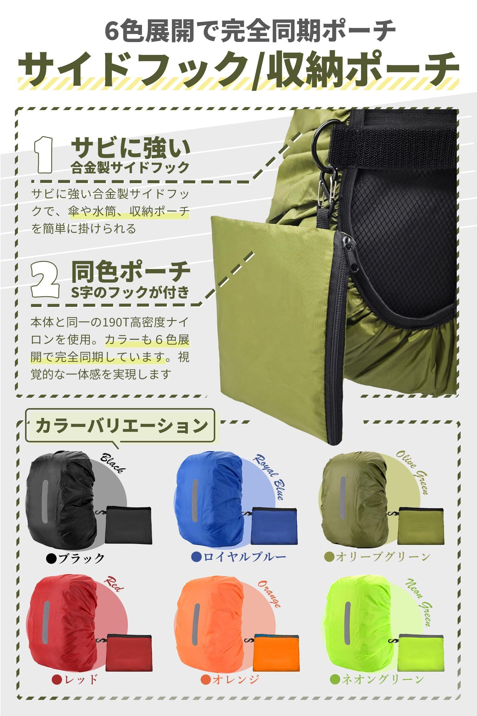 このリュックカバーは、超薄型マジックテープ(2.5mm)を採用し、従来の硬いバックル(9mm)と比べて背中に当たらない設計。長時間の背负いでもストレスフリーです。十字型固定ベルトデザインで強風の中でもリュックをしっかりロックし、上部までピッタリ覆うザックカバーだから、登山から通勤・通学まであらゆるシーンで安定感が抜群。高防水ナイロン素材(耐水圧2000mm)を使用しているため、突然の雨でも中身は完全防水。背面には縦長の高輝度反射ステッチを施し、暗がりや悪天候でも視認性バツグンです。さらに、サビに強い合金製サイドフックで傘や水筒を簡単に掛けられ、収納可能なポーチ(S字フック付き)でレインカバーをサッと出し入れ可能。使い勝手の良さも特徴です。全6サイズ×6カラー展開(収納ポーチ同色)で、サイズ選びに迷った場合は商品ページの目安表を参考にしてください。万が一合わなくても返品・交換に対応しています。