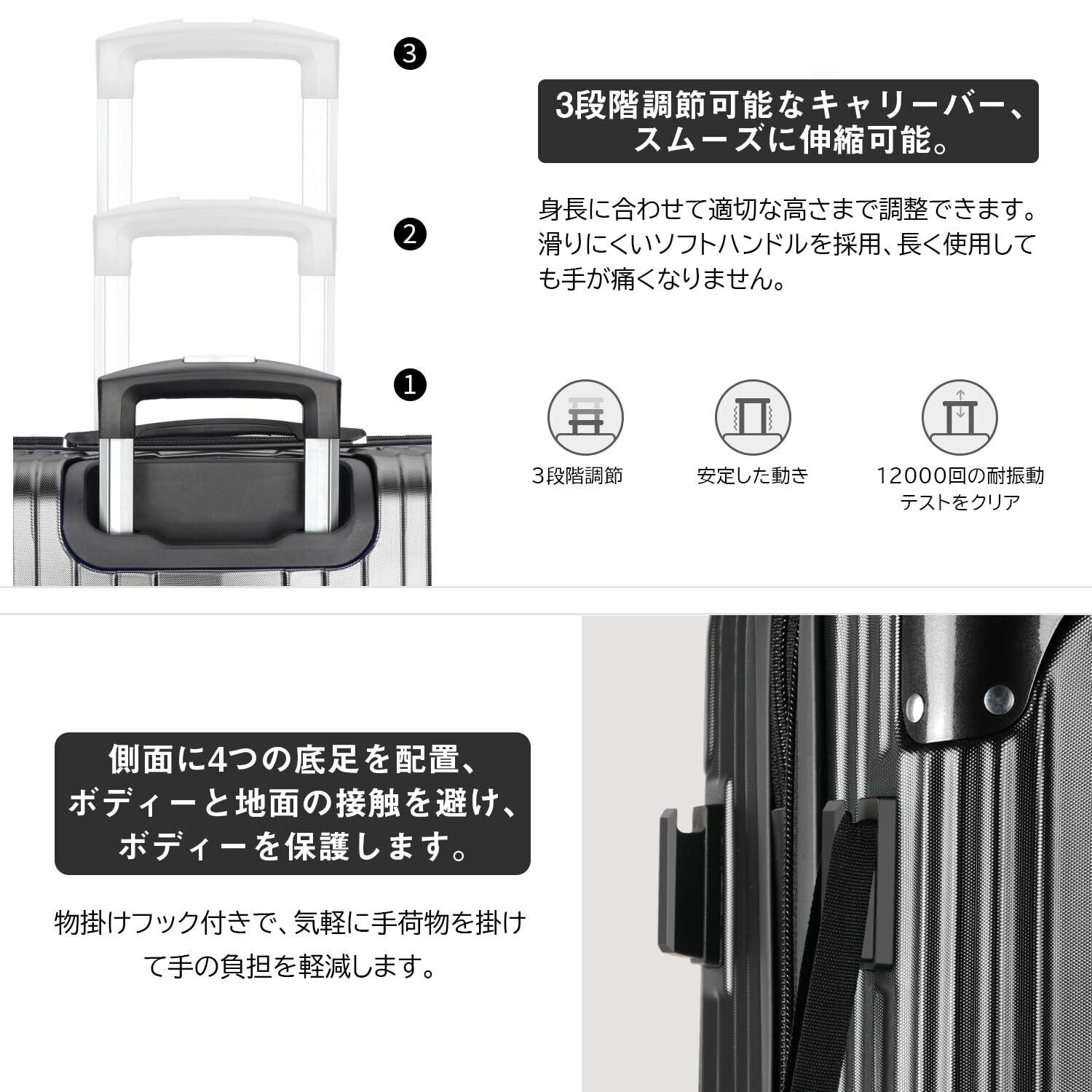 【静音キャスター&調節可能なキャリーバー】キャリーケースは三段階調節なアルミ合金制キャリーバーを採用し、スムーズに伸縮可能。TPE素材で作られた静音キャスターが走行中の振動を軽減し、高耐摩耗性、静音性を実現しながら、360°自由に回転可能。後ろの2個のキャスターにストッパー付き、傾斜のある地面でも簡単にキャスターの動きを止められ、移動中のストレスを軽減。