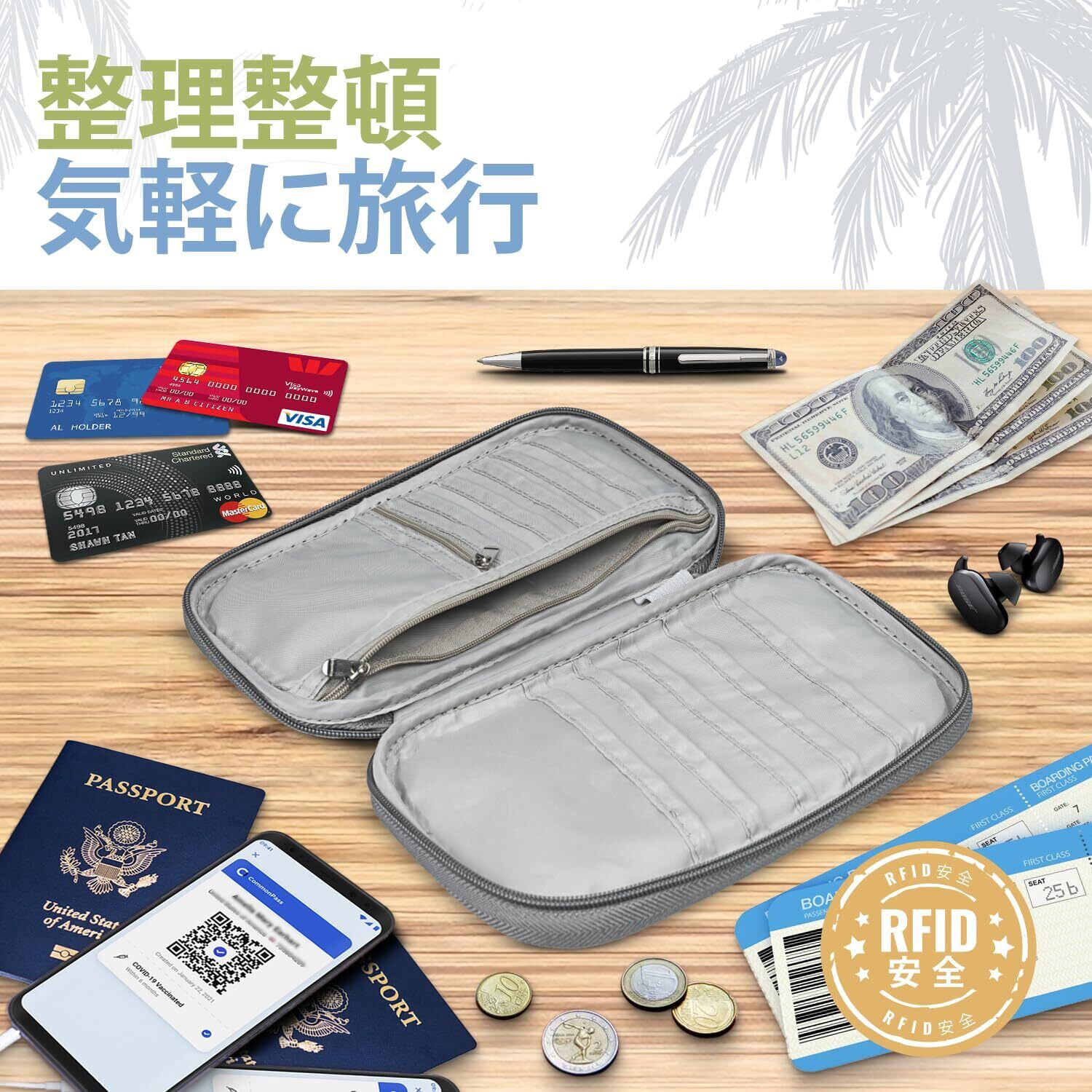パスポート用のホルダー5つ、クレジットカード用のスロット5つ、6枚以上の搭乗券が収納できるポケット1つ、お金やチケット用のジッパー付きポケットが備えられたこのパスポートケースは、あなたの旅行を安全かつスムーズにします。