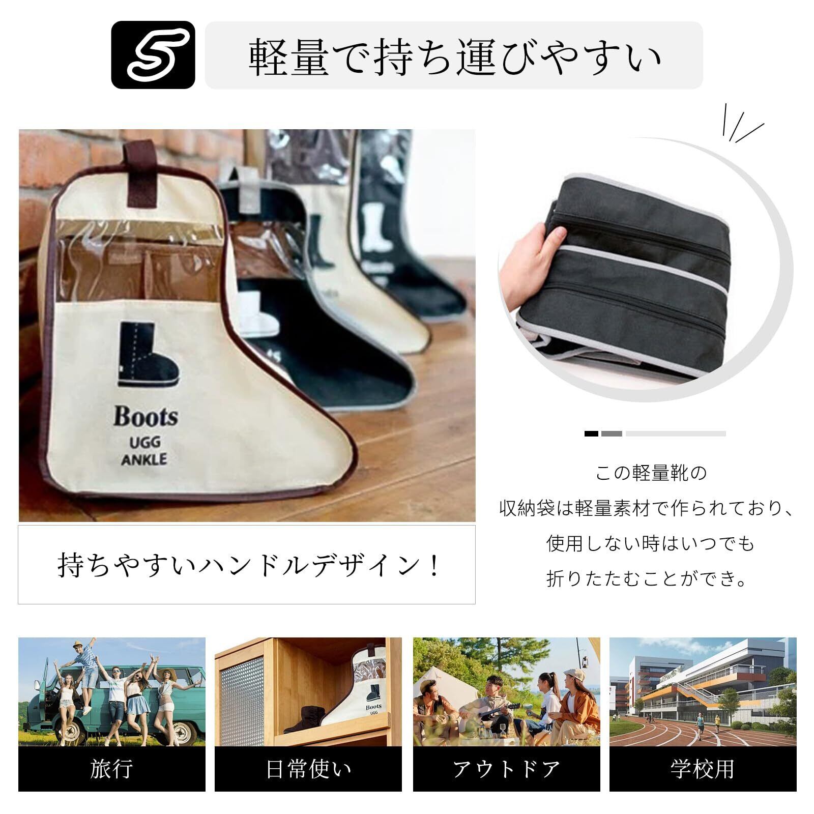 軽量で持ち運びやすい:この軽量靴の収納袋は軽量素材で作られており、使用しない時はいつでも折りたたむことができ、キャリーハンドルのデザインは持ち運びや収納に便利です。