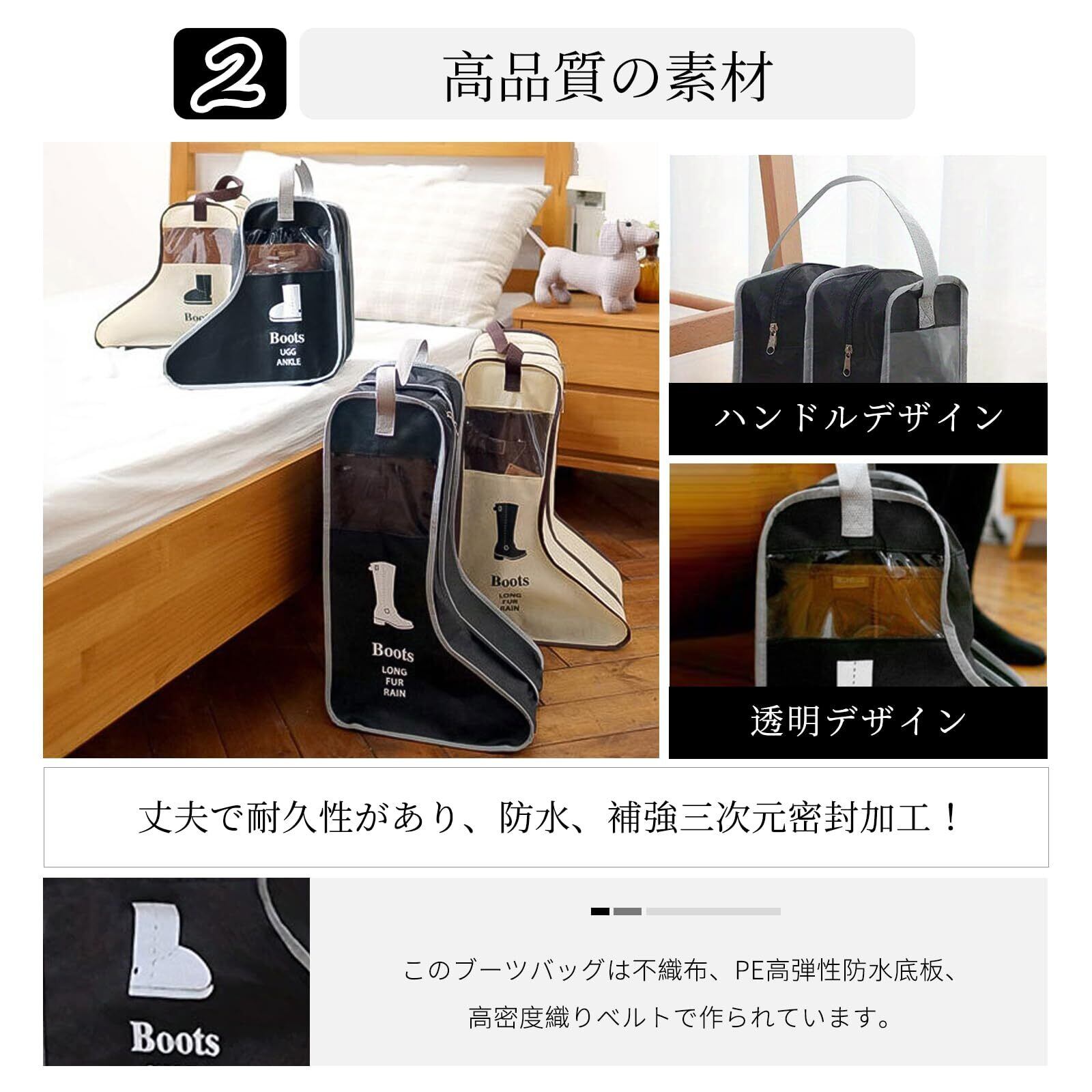 シューズケースのサイズは、ロングブーツ用が29x24x47cm、ショートブーツ用が28x24x29cmの2種類で、いずれもベージュとブラックの2色。
